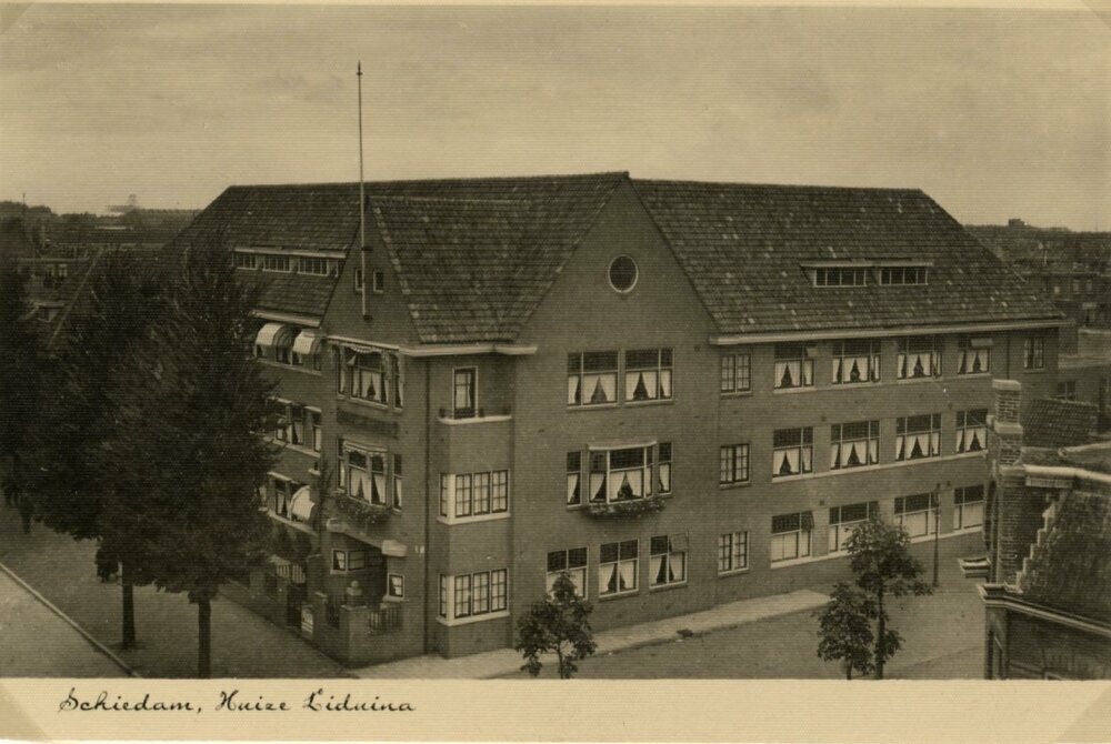 De Warande gezien vanaf de Sint Liduinastraat in de richting van de Burgemeester Knappertlaan. In het midden de kerk van de Christelijk Gereformeerde Gemeente. Prentbriefkaart