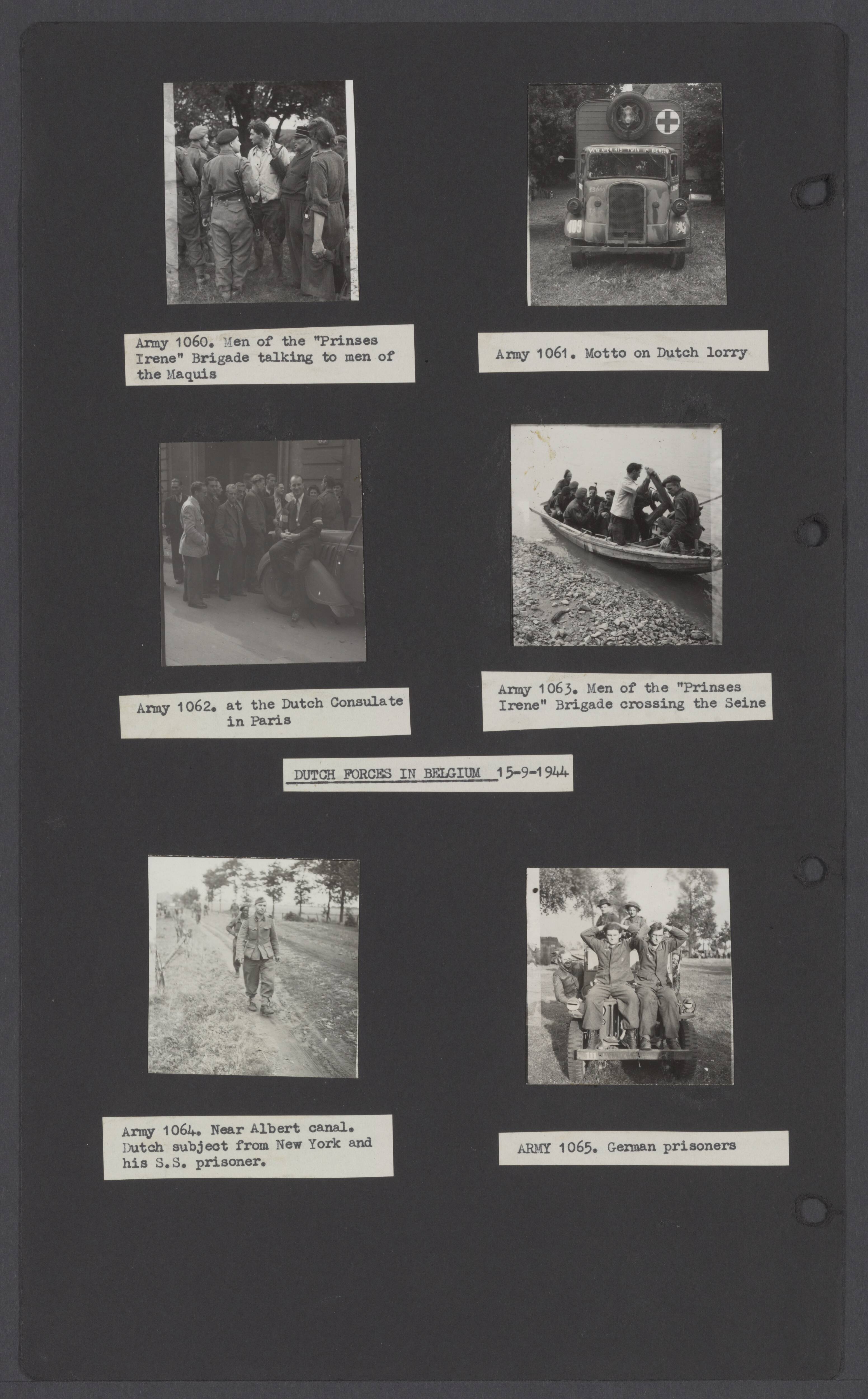 Army 1065 Duitse krijgsgevangenen worden op een jeep binnengebracht door militairen van de Irene Brigade. De foto is genomen bij het Albertkanaal. Army 1064 Een Nederlandse soldaat afkomstig uit New York met een Duitse gevangene. Foto is genomen bij het Albertkanaal. Army 1063 Een groep soldaten van de Irene Brigade steekt de Seine over. Army 1062 In Parijs ondergedoken Nederlanders, die een vrijwilligerscorps hebben gevormd, voor het Nederlandse consulaat in Parijs. Army 1060 Soldaten van de Irene Brigade in gesprek met leden van de Maquis. Army 1061 Nederlandse Rode Kruis-truck met de kop van een wild zwijn. Het motto boven de voorruit van de truck luidt "We're after his twin in Berlin".