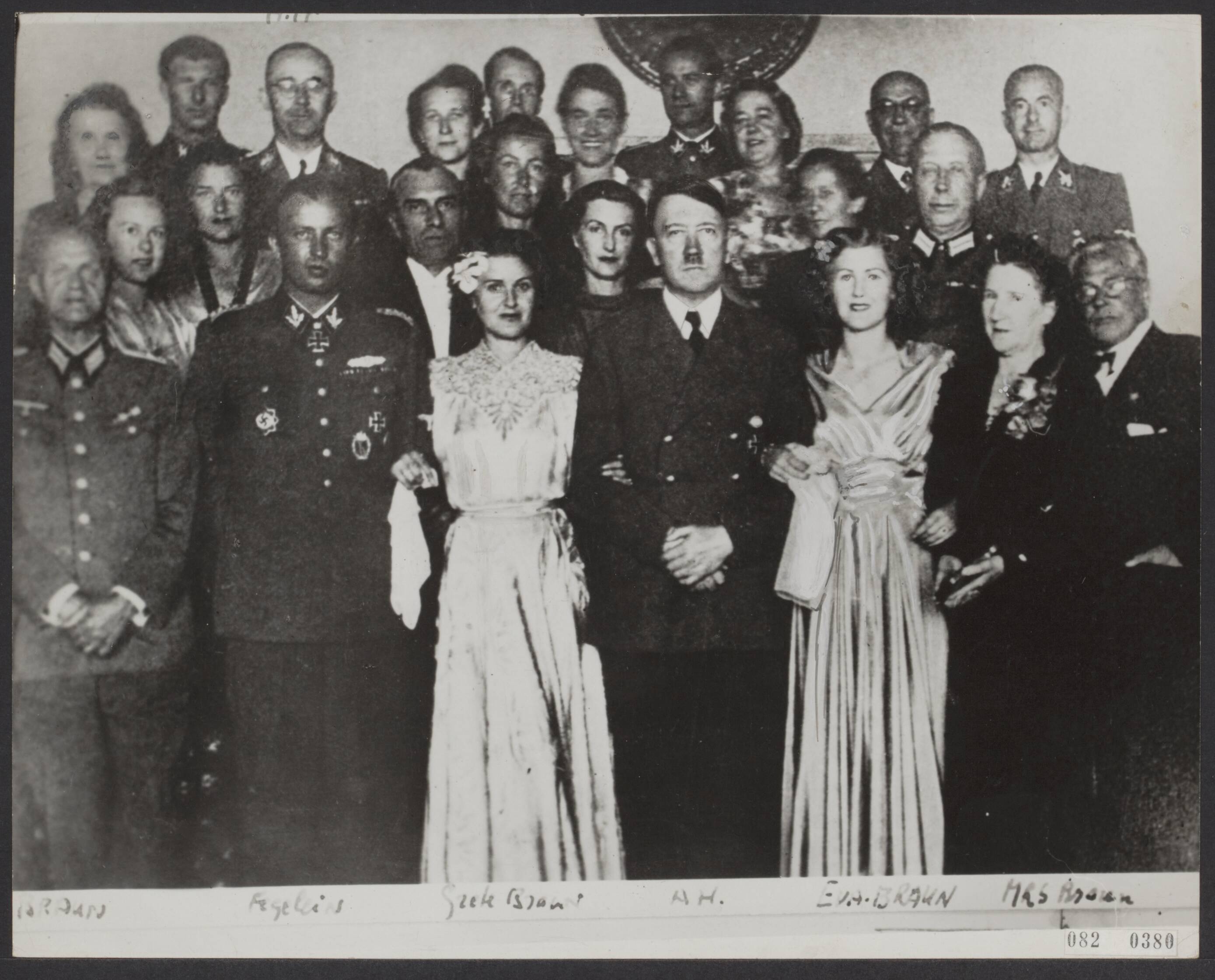 Huwelijk van Hermann Fegelein en Grete Braun. Groepsportret met in het midden Adolf Hitler, rechts naast hem Eva Braun, daarnaast de ouders van Eva Braun. Aan de ander zijde de zuster van Eva Braun, Greta Braun met haar bruidegom Hermann Fegelein