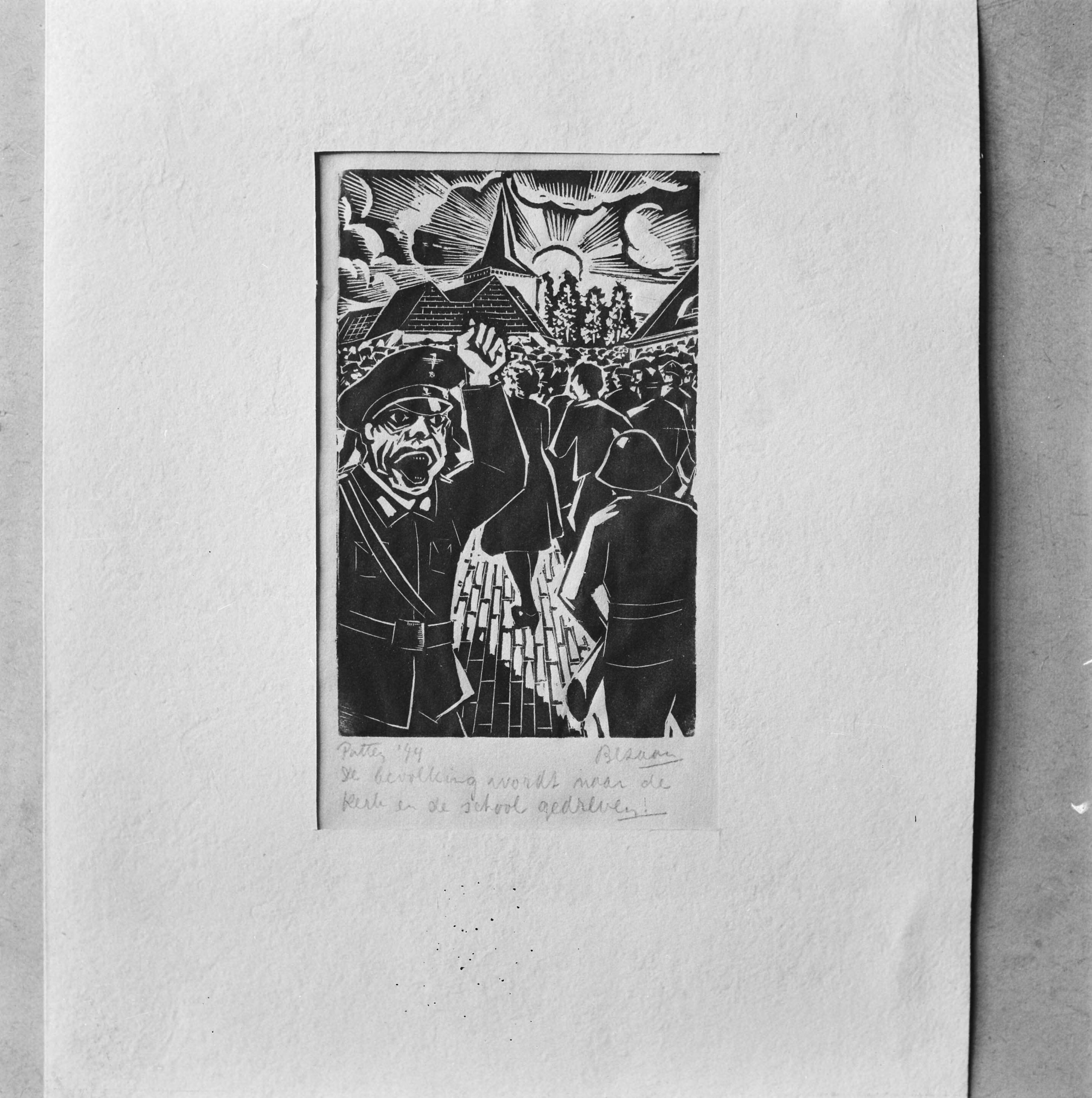 Houtsnede van Bezaar "De bevolking wordt naar de kerk en de school gedreven"