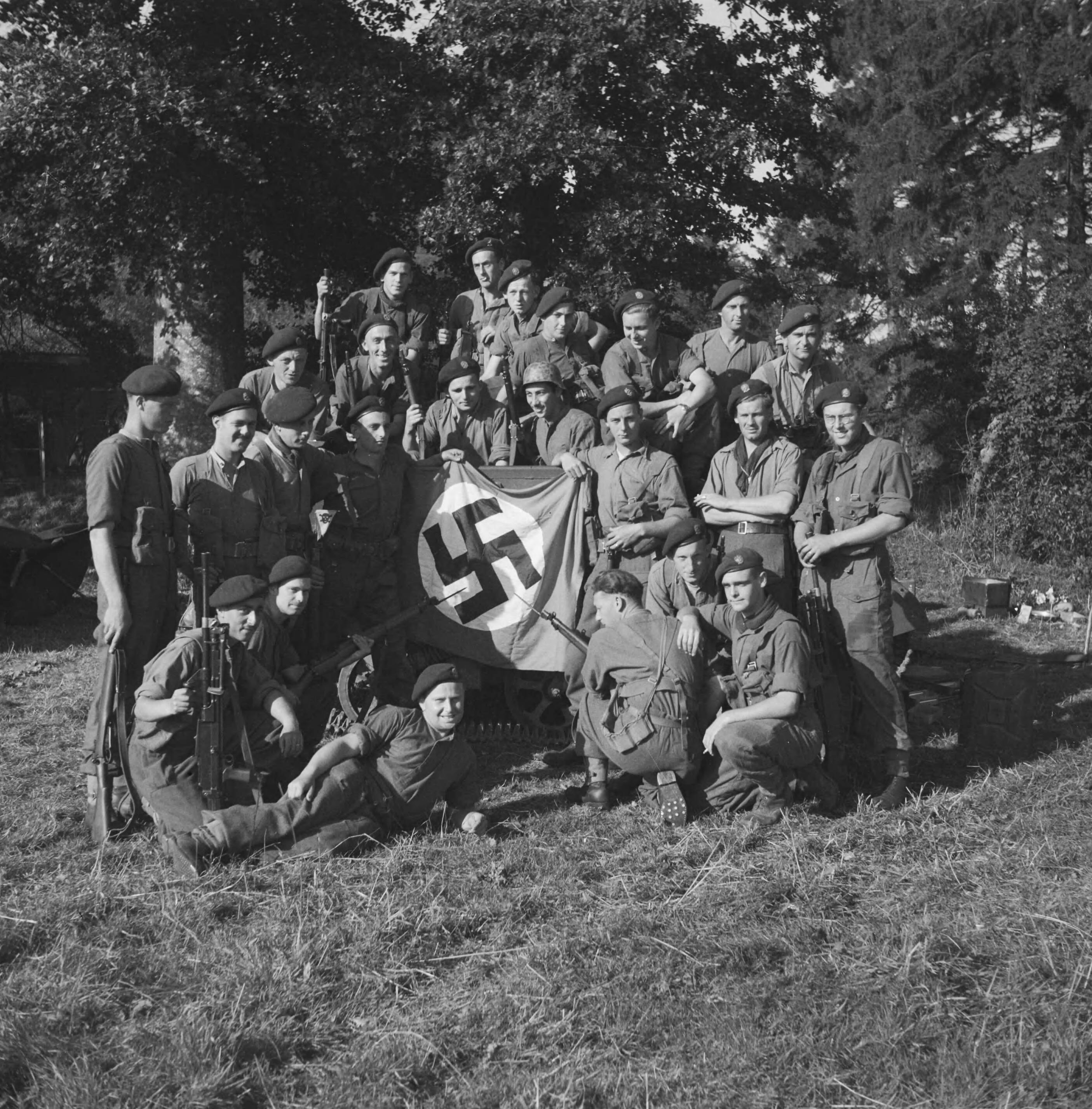 Prinses Irene Brigade in Frankrijk. Een groep soldaten met een buitgemaakte Duitse nazi-vlag