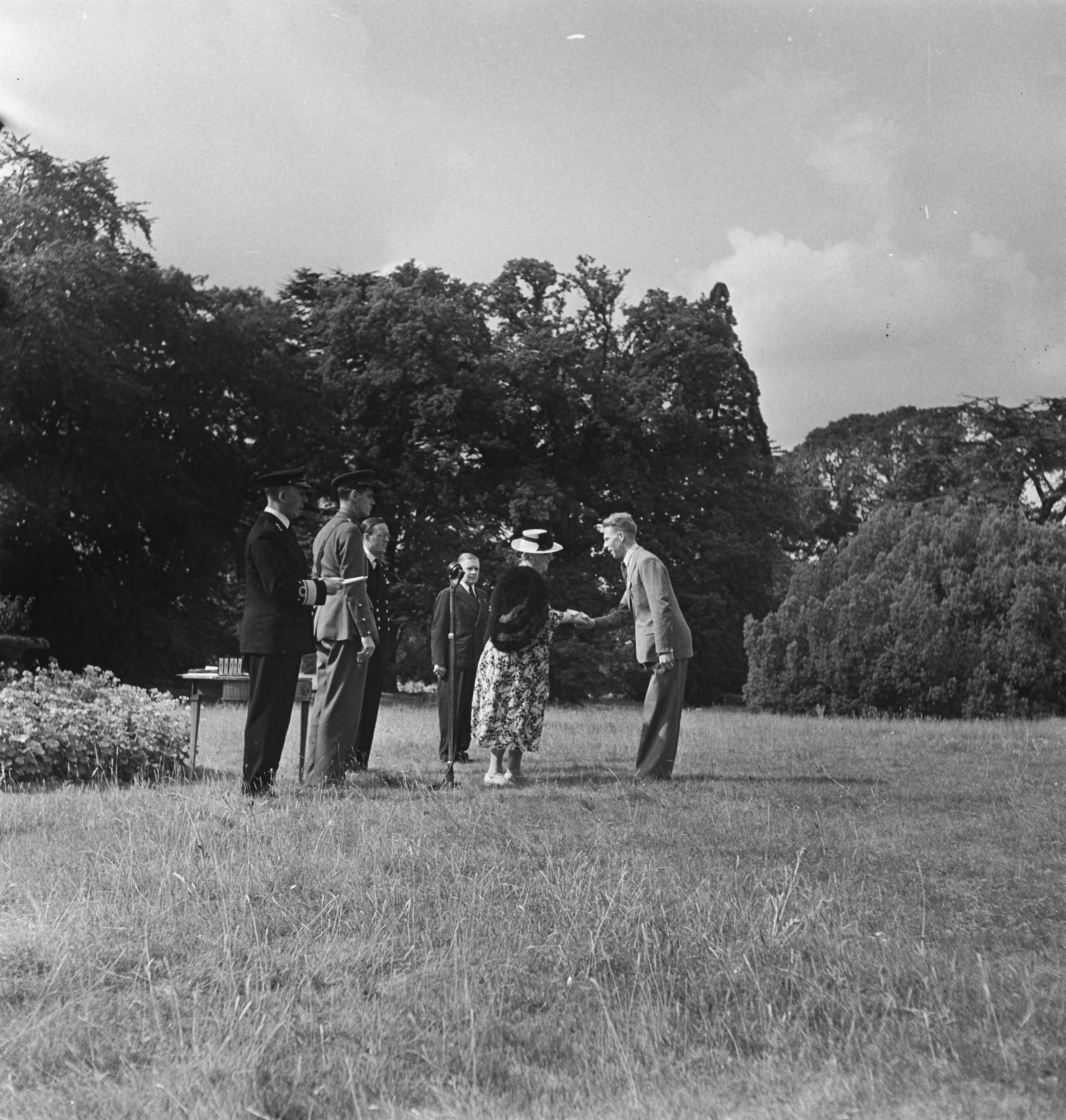 Koningin Wilhelmina reikt onderscheidingen uit in de tuin van haar privé-verblijf in Engeland Stubbings House, Maidenhead, o.a.