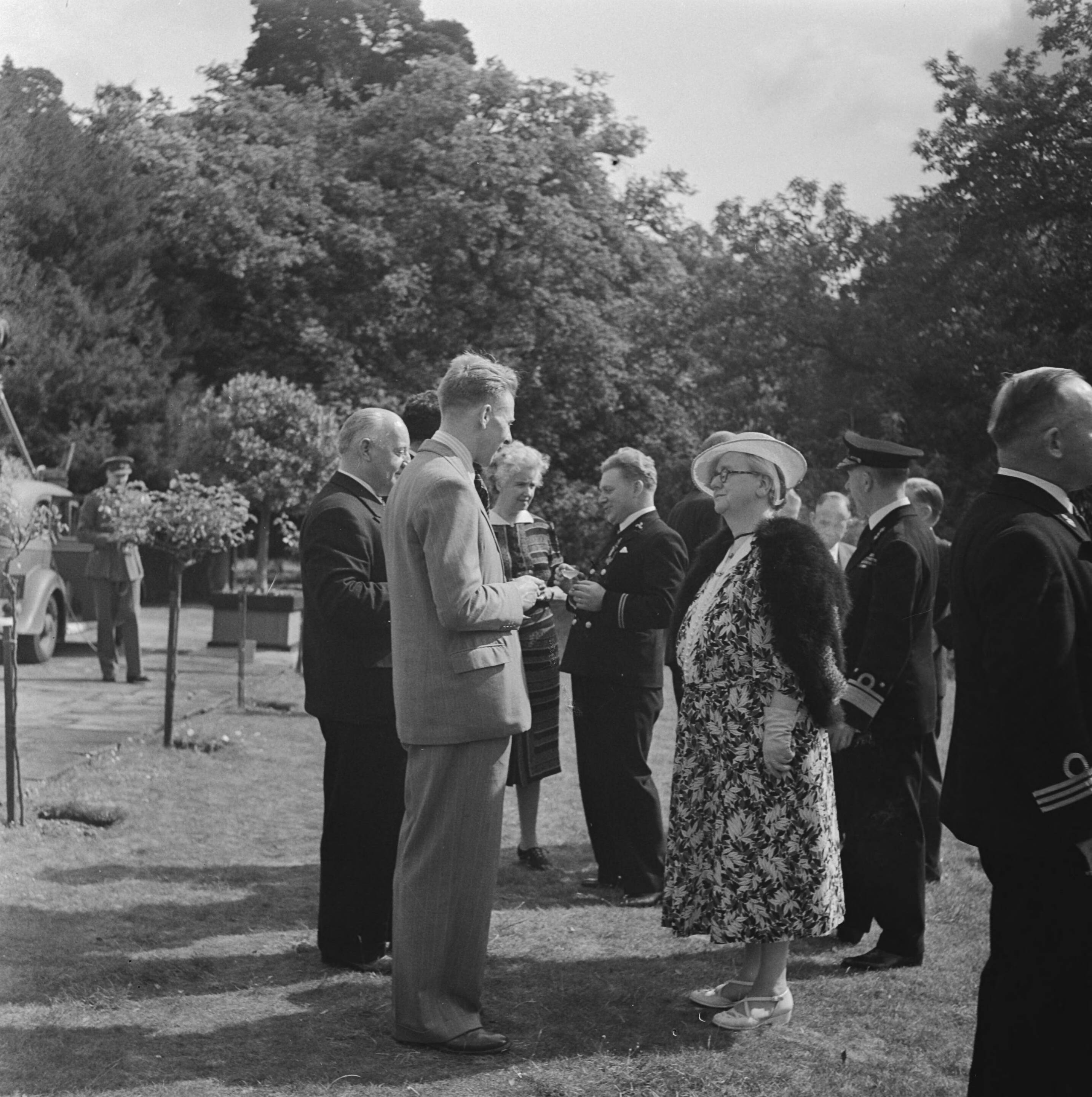Koningin Wilhelmina reikt onderscheidingen uit in de tuin van haar privé-verblijf in Engeland Stubbings House, Maidenhead, o.a. aan leden van de Koopvaardij