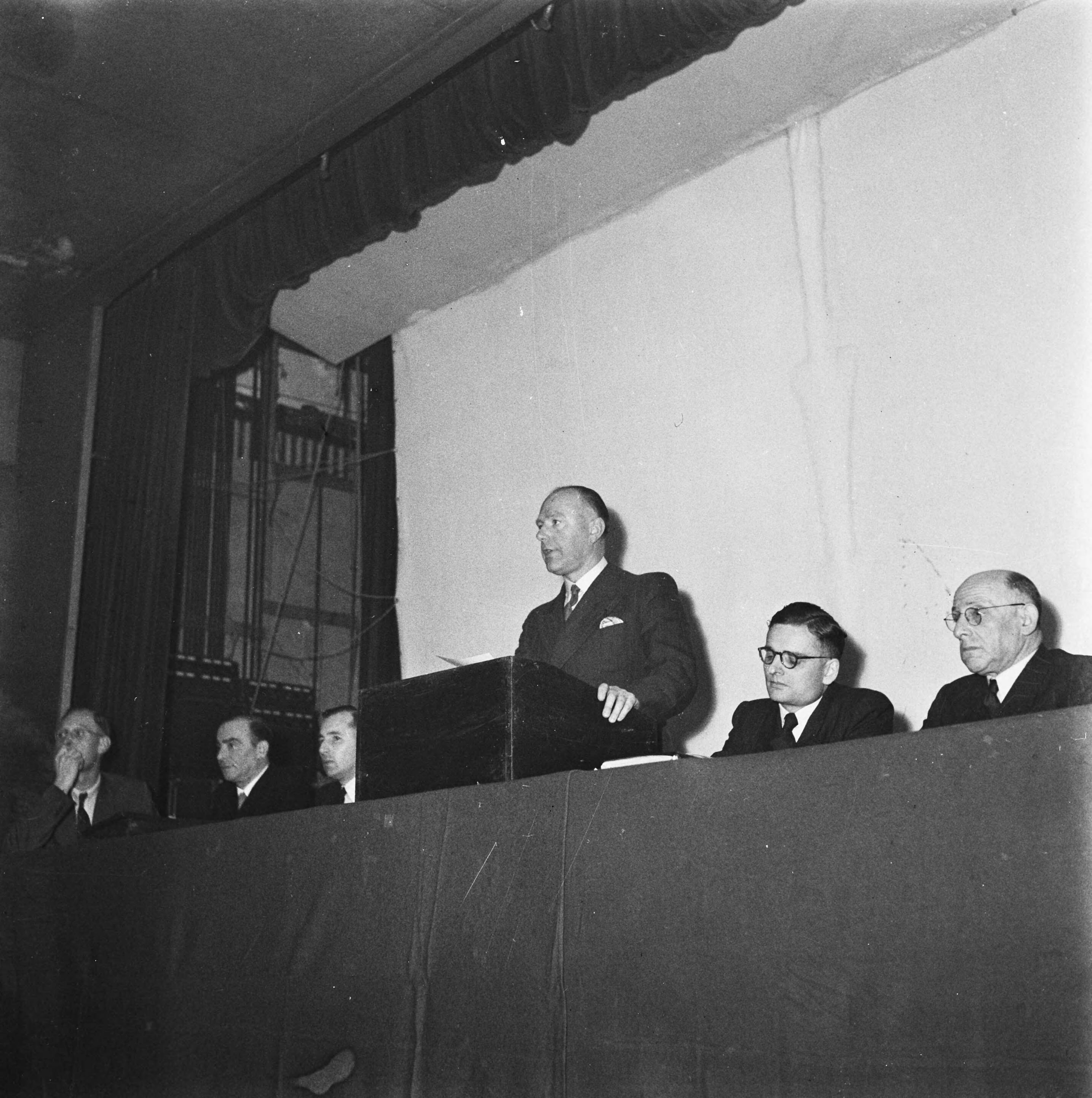 Vergadering van de Nederlandse Bioscoopbond. Waarnemend voorzitter J. Miedema tijdens zijn openingsrede