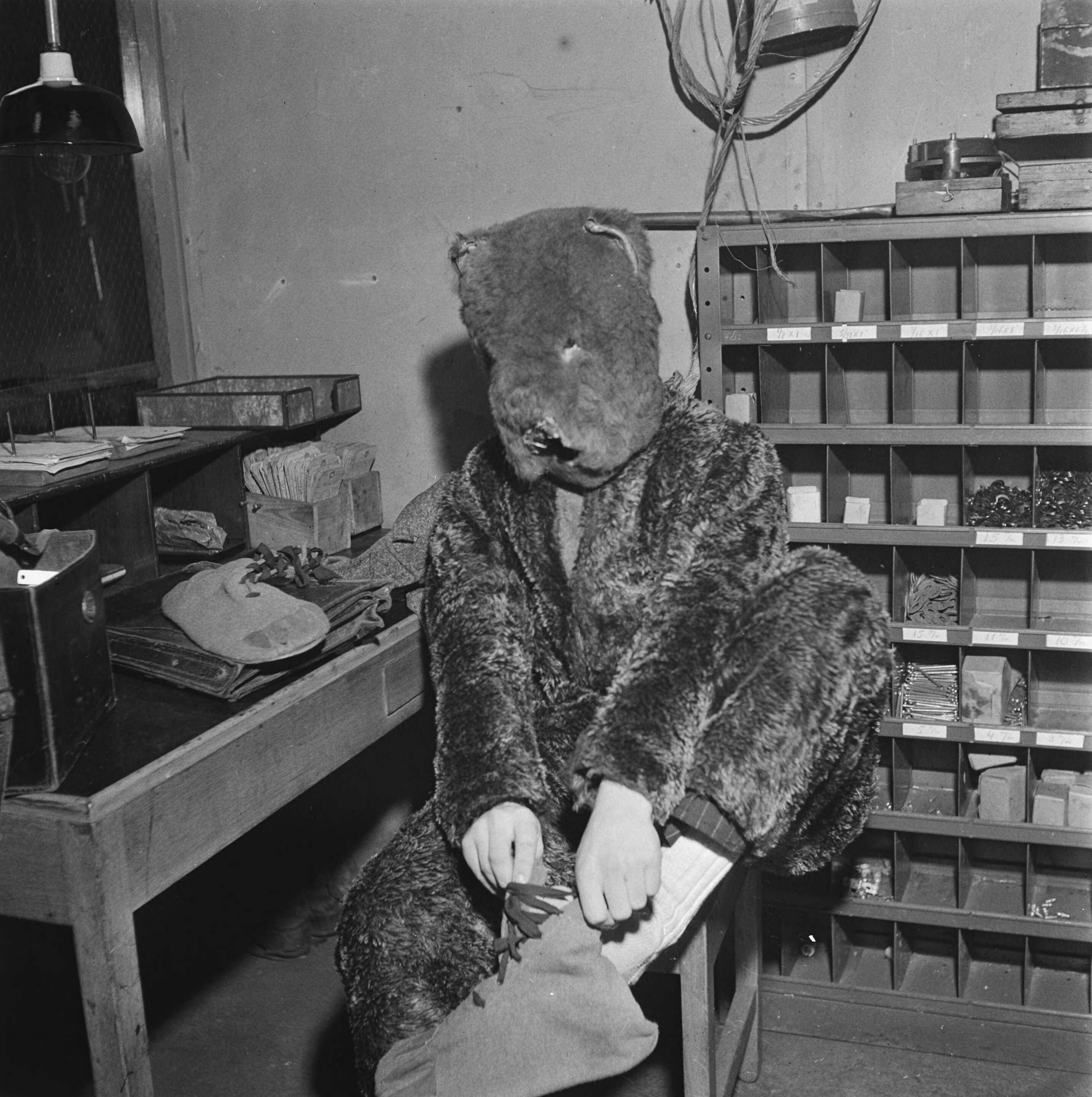 Aankomst Sint Nicolaas te Amsterdam. Man hult zich in berenpak