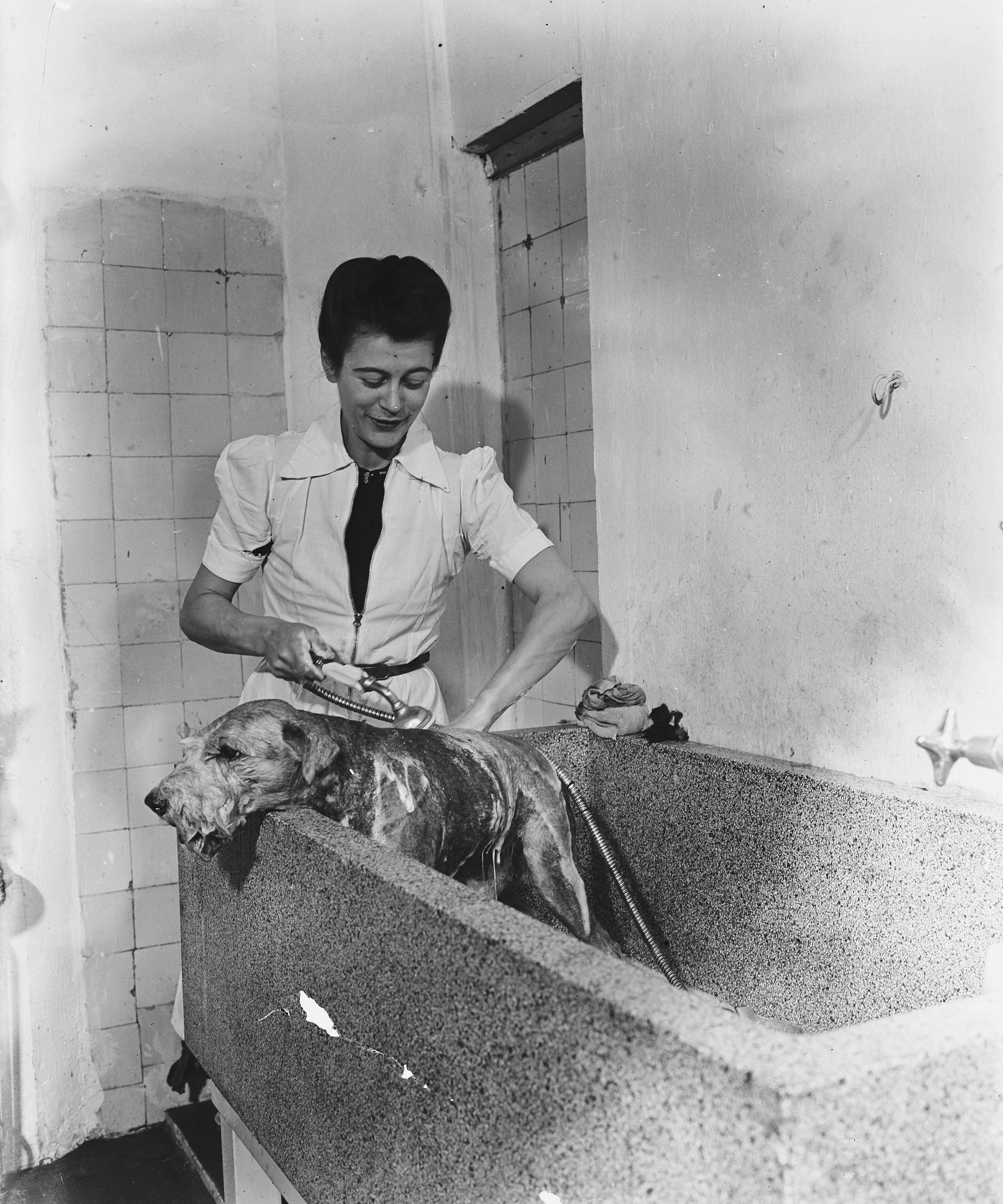 Een hond wordt in bad gewassen in een trimsalon