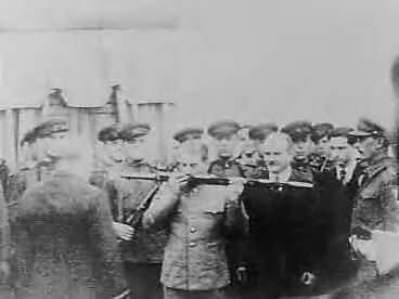 Archieffoto. Stalin kust zwaard van Stalingrad op de Russische ambassade te Teheran tijdens de conferentie van Teheran. Naast hem Molotov