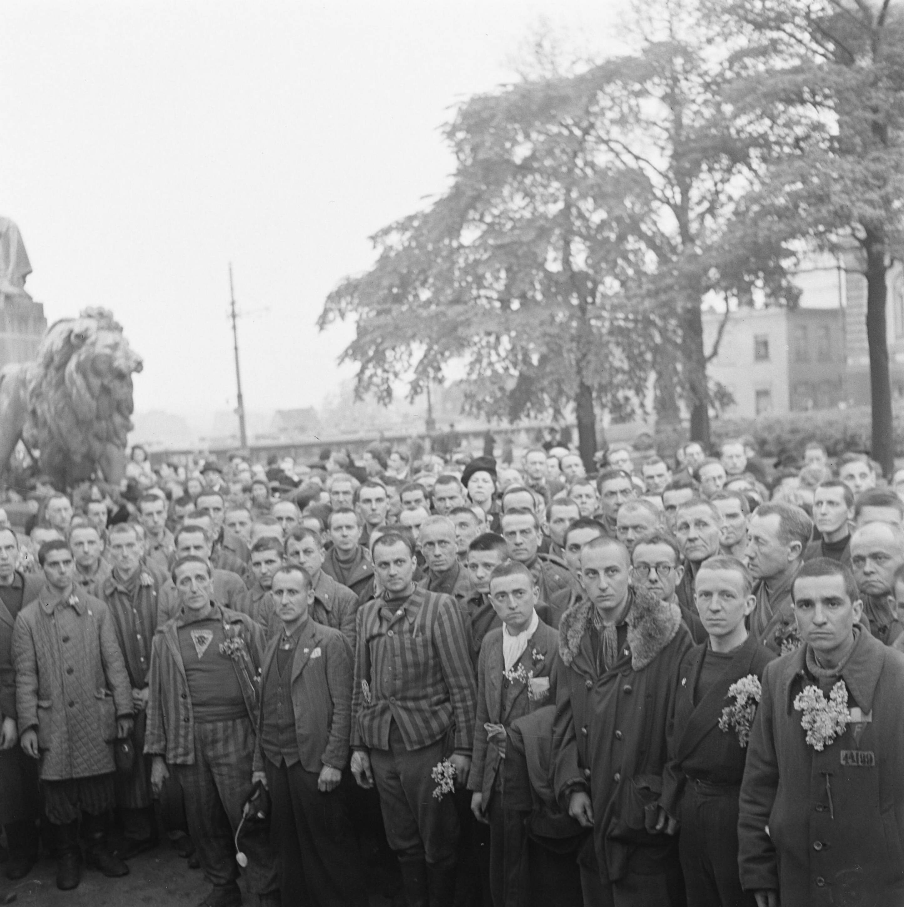 Kranslegging door bevrijde Franse politieke gevangenen op het graf van de Onbekende Soldaat te Brussel.