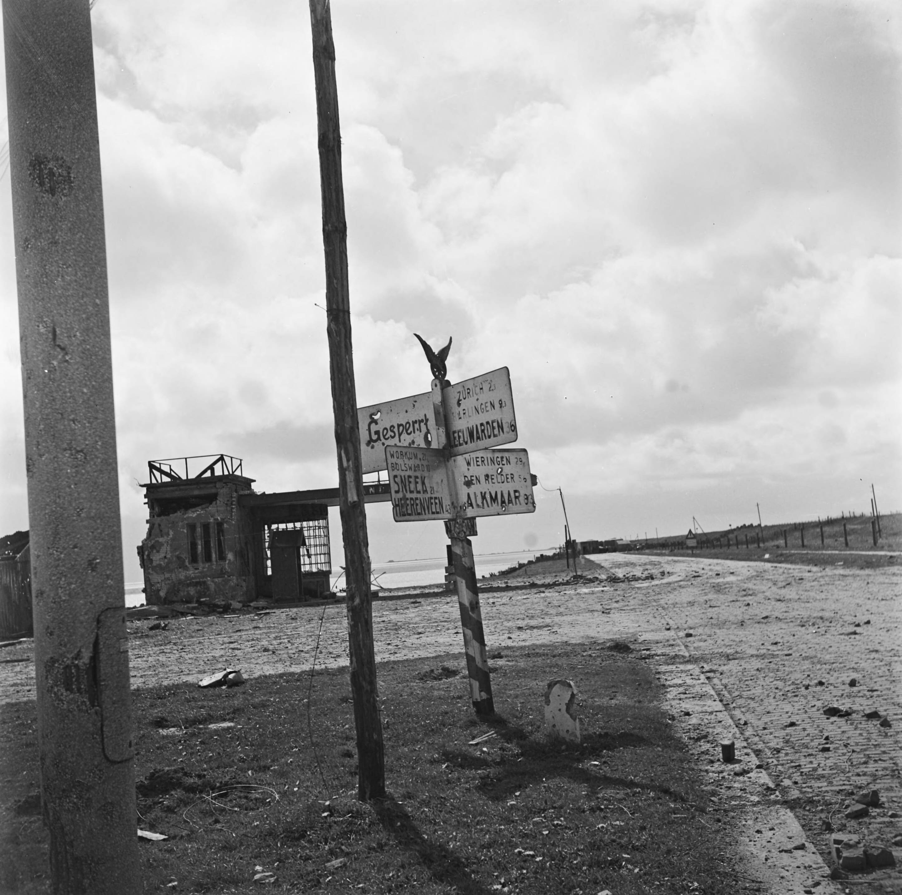 Duitse wachtpost en bunkers (en ANWB-bord) bij de Kop van de Afsluitdijk. Dit strategische punt werd door de Canadese 3e Infanterie Divisie na drie dagen strijd veroverd (18 april 1945).