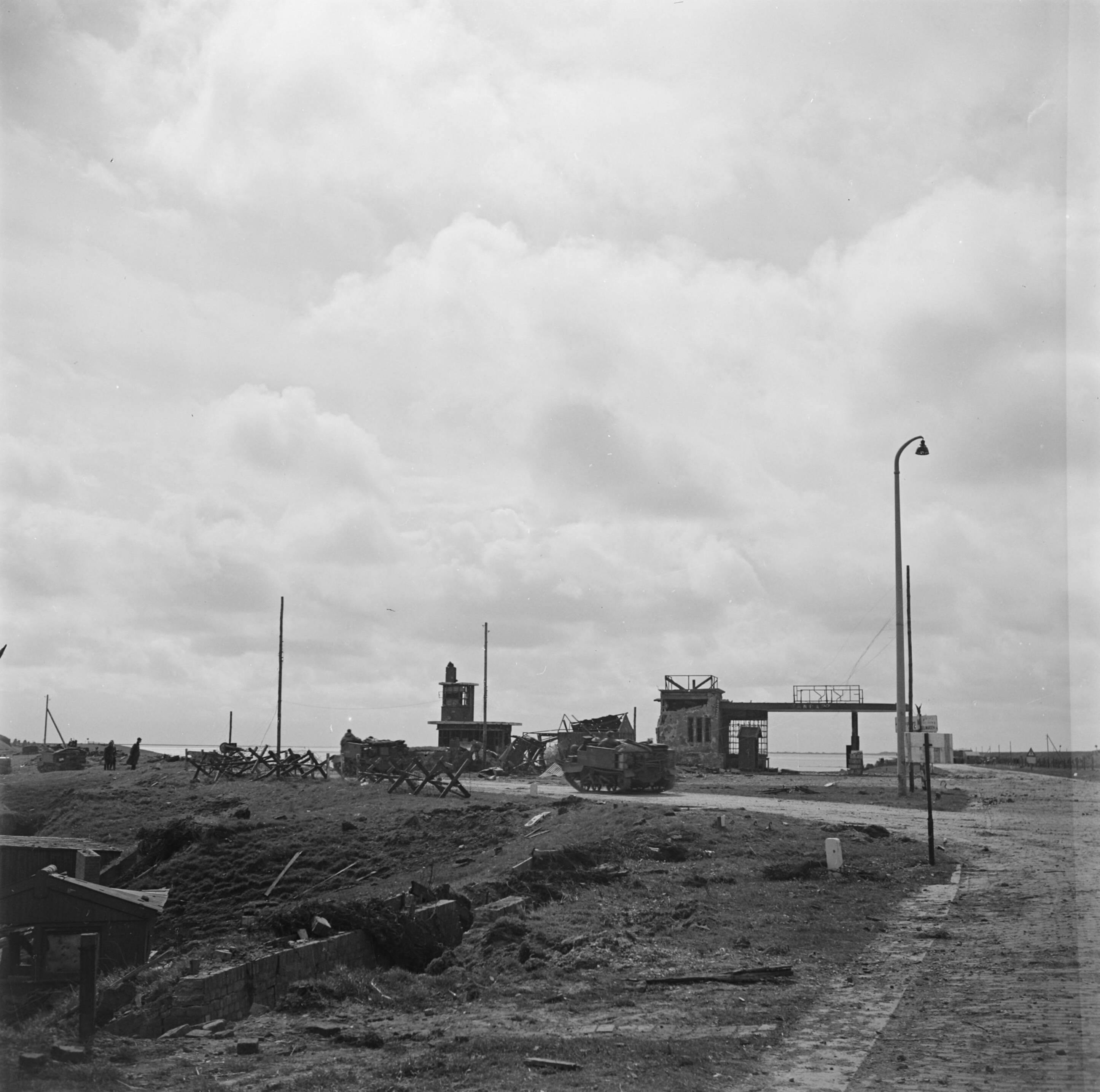 Carriers van de 3e Canadese Infanterie Divisie aan de Kop van de Afsluitdijk. Op de achtergrond het vernielde benzinestation.