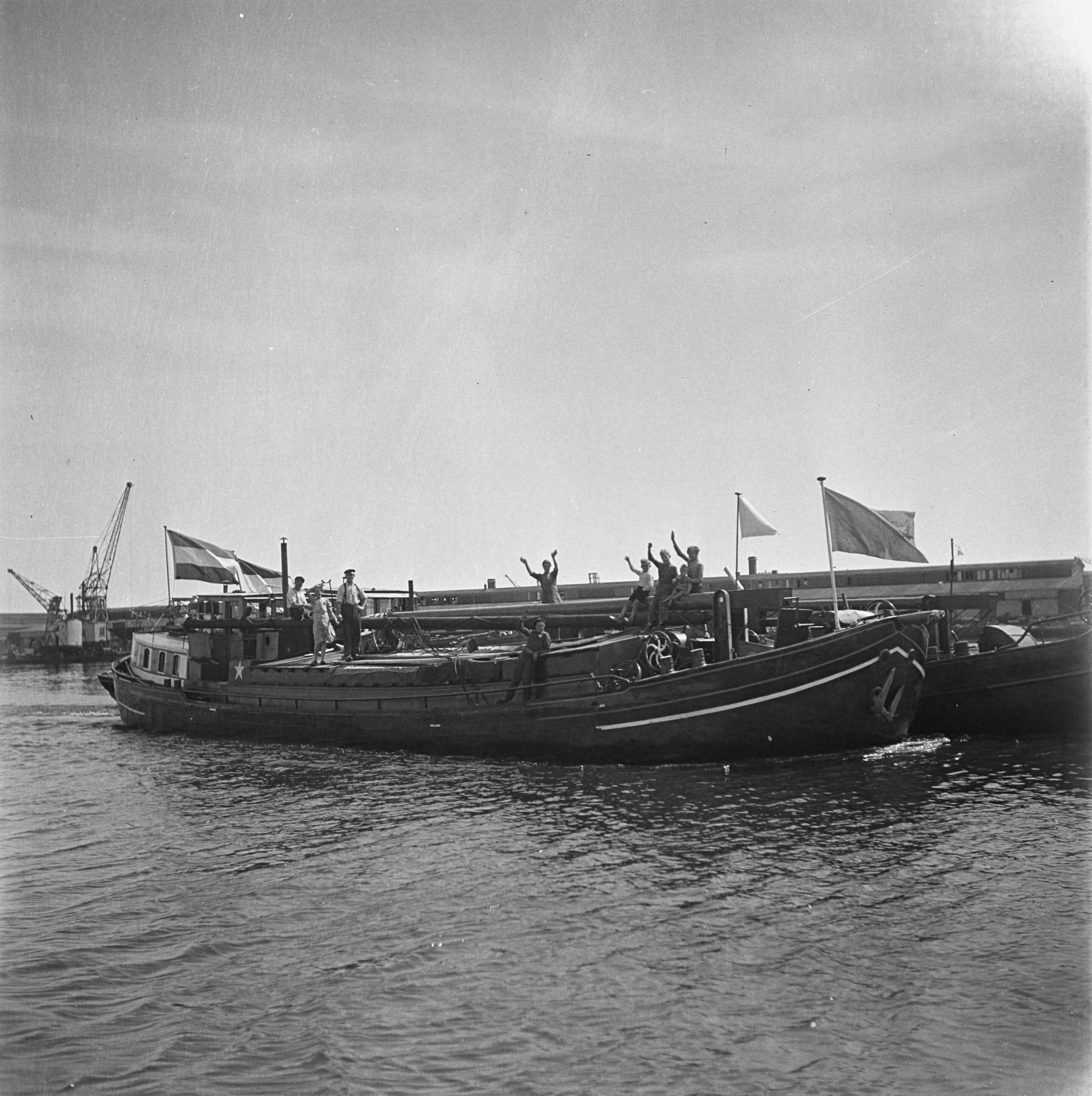 Vanaf een binnenschip wordt gezwaaid naar de fotograaf
