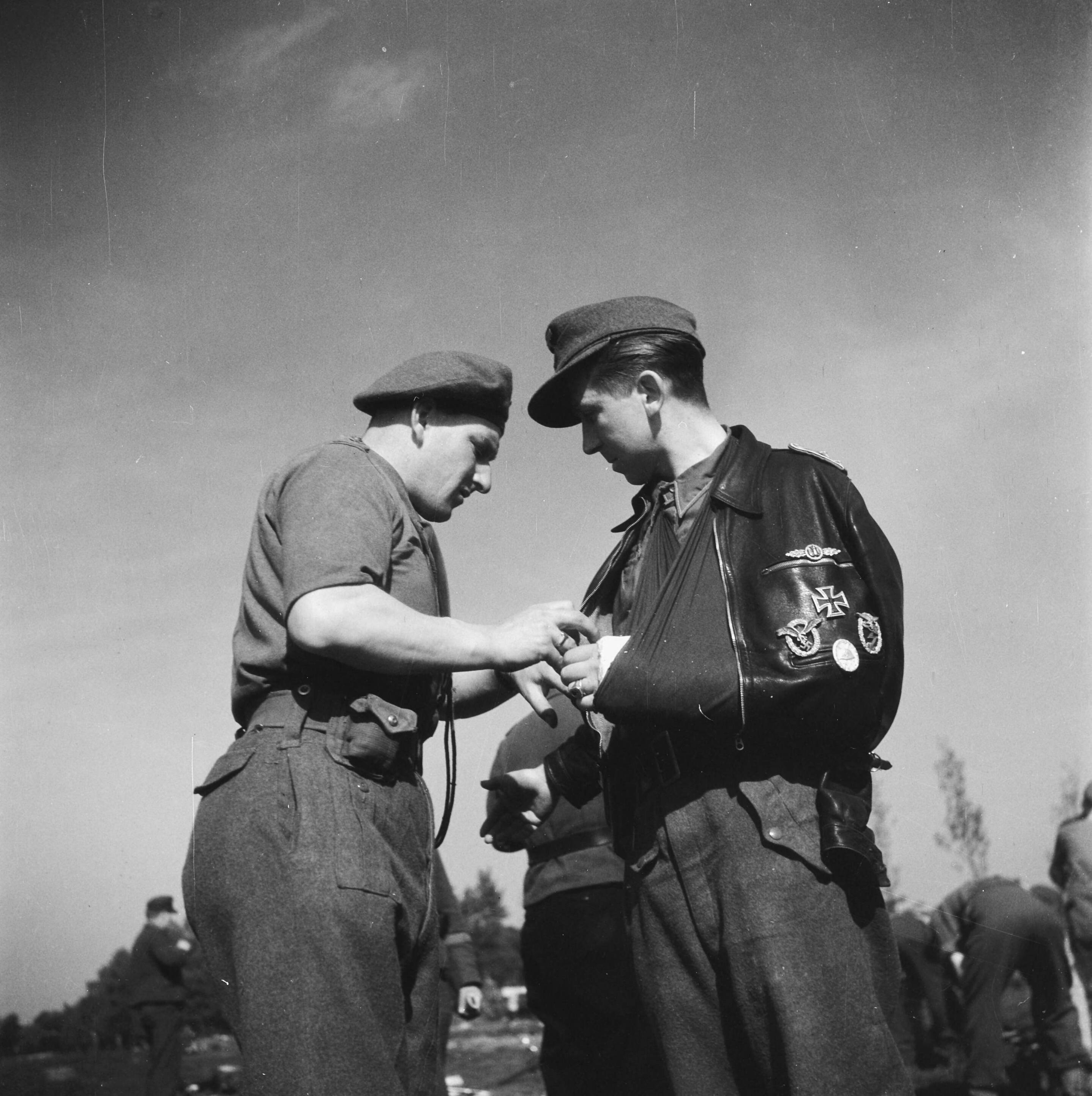 Inleveren van wapens door de Duitsers. Gewonde Duitse piloot met hoge onderscheidingen wordt onderzocht door Britse soldaat op de ontwapeningvelden in Soest