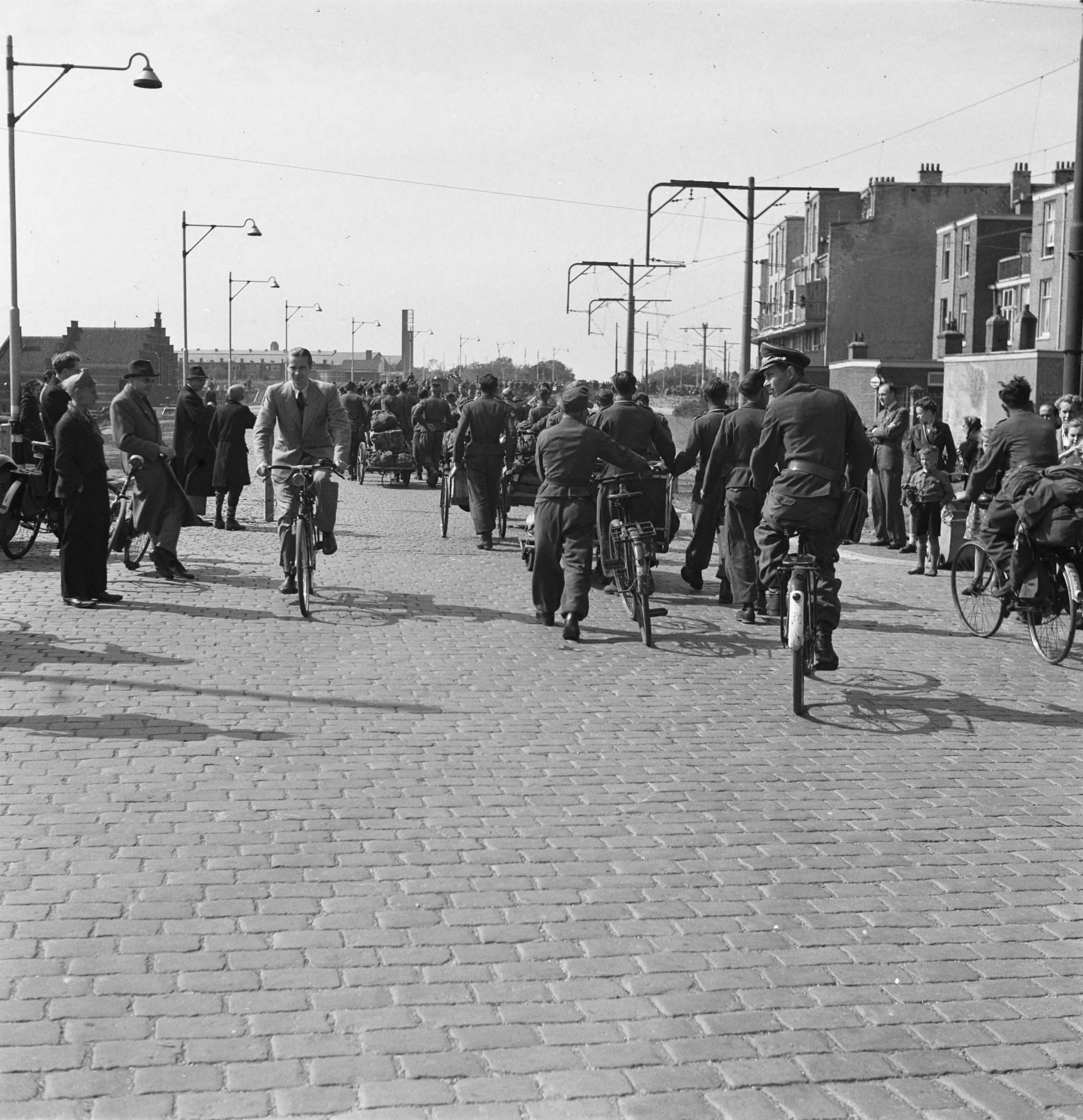 De Duitsers verlaten Den Haag. Suezkade, achtergrond toren Houtrust