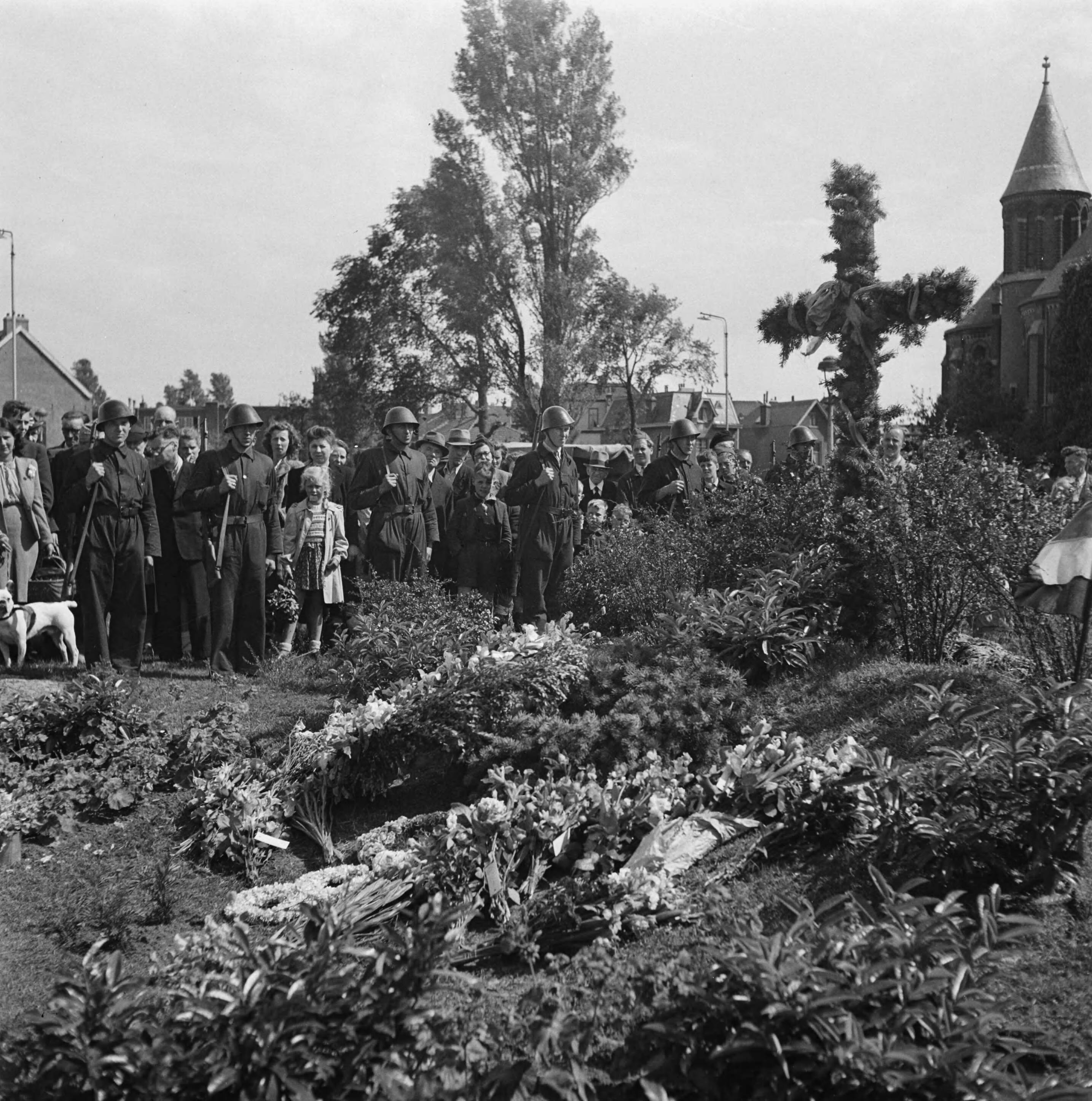 Plechtigheden bij de graven van gefusilleerden te Zijpe, St. Pancras en Haarlem. Westergracht Haarlem