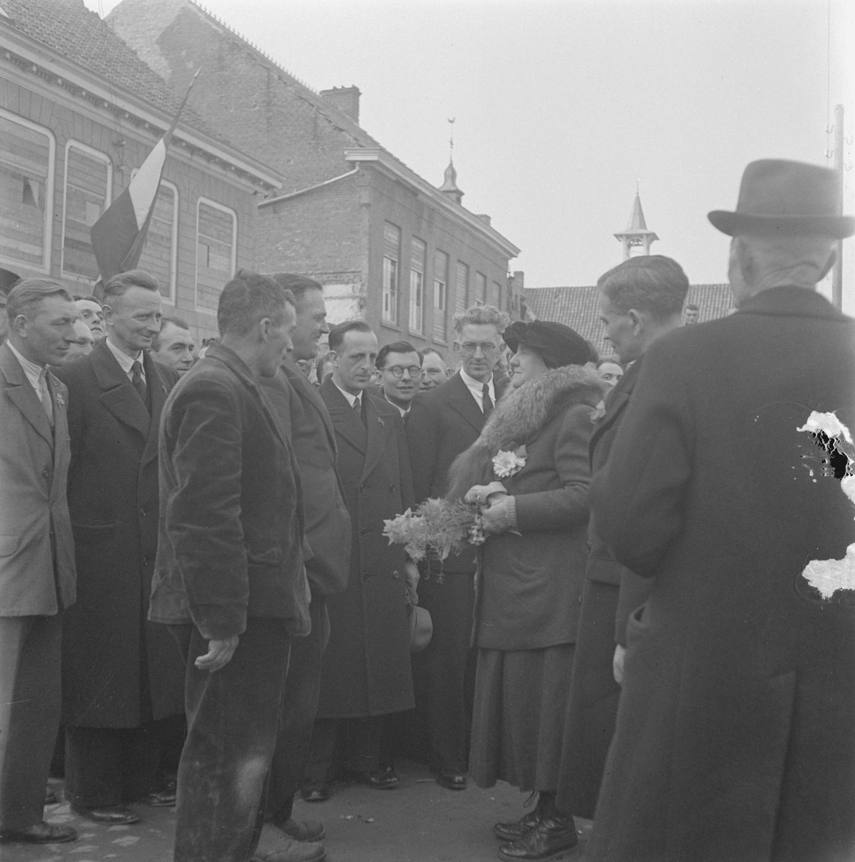IJzendijke. Koningin Wilhelmina in gesprek met een groep mannen