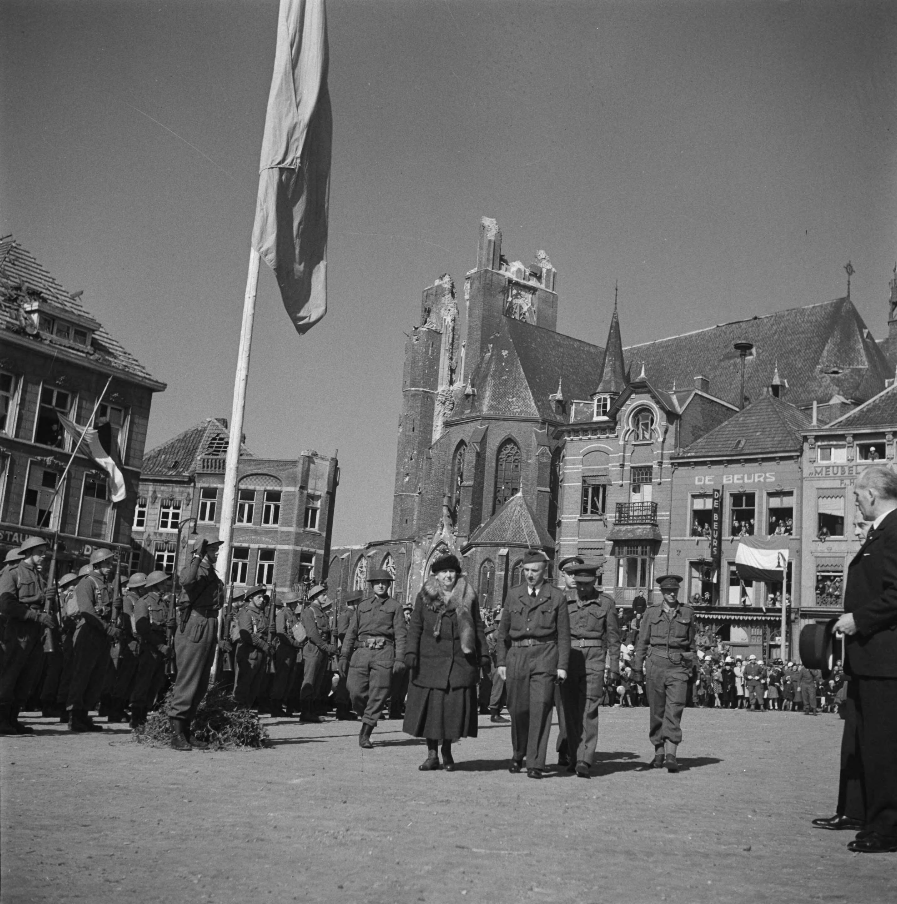 Roermond. Koningin Wilhelmina inspecteert de erewacht op het Marktplein