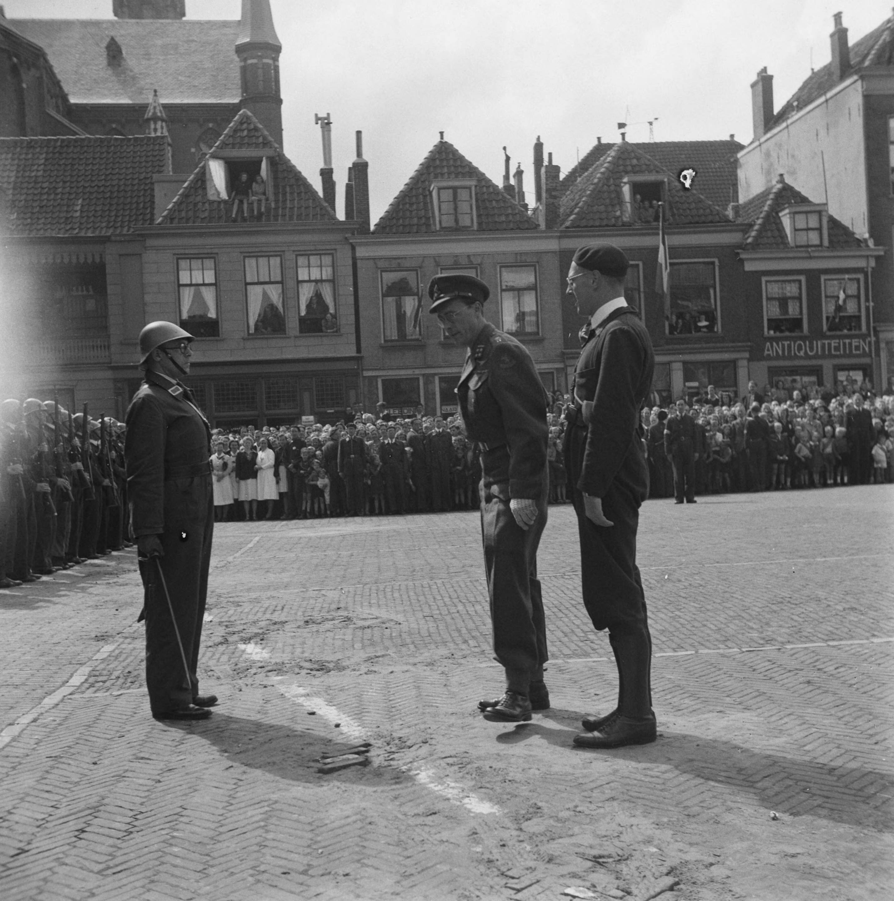 De prins begroet de commandant van de erewacht van de Binnenlandse Strijdkrachten op de Markt te Delft