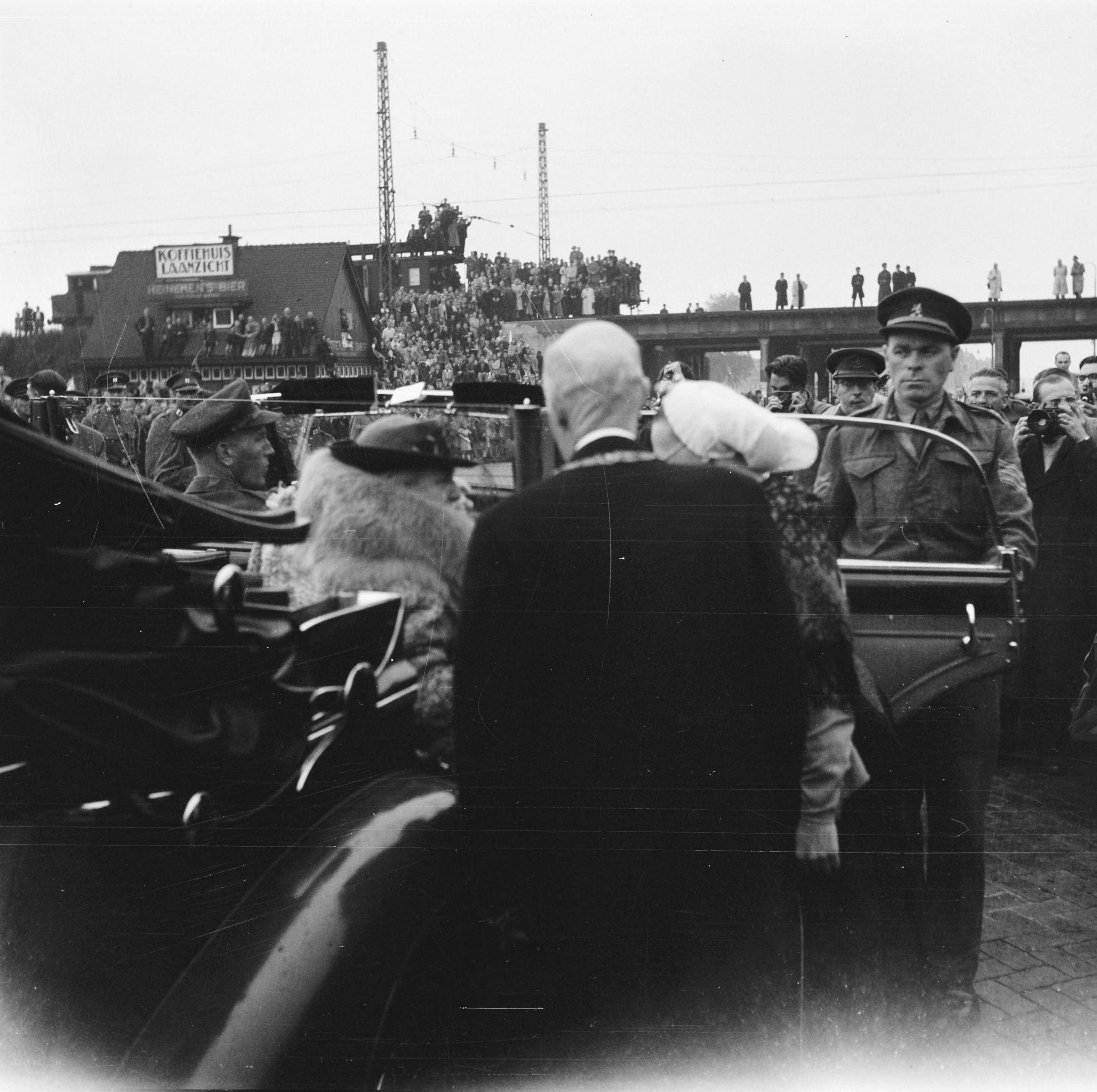 Koningin Wilhelmina stapt uit haar auto. Op de rug gezien burgemeester De Monchy.