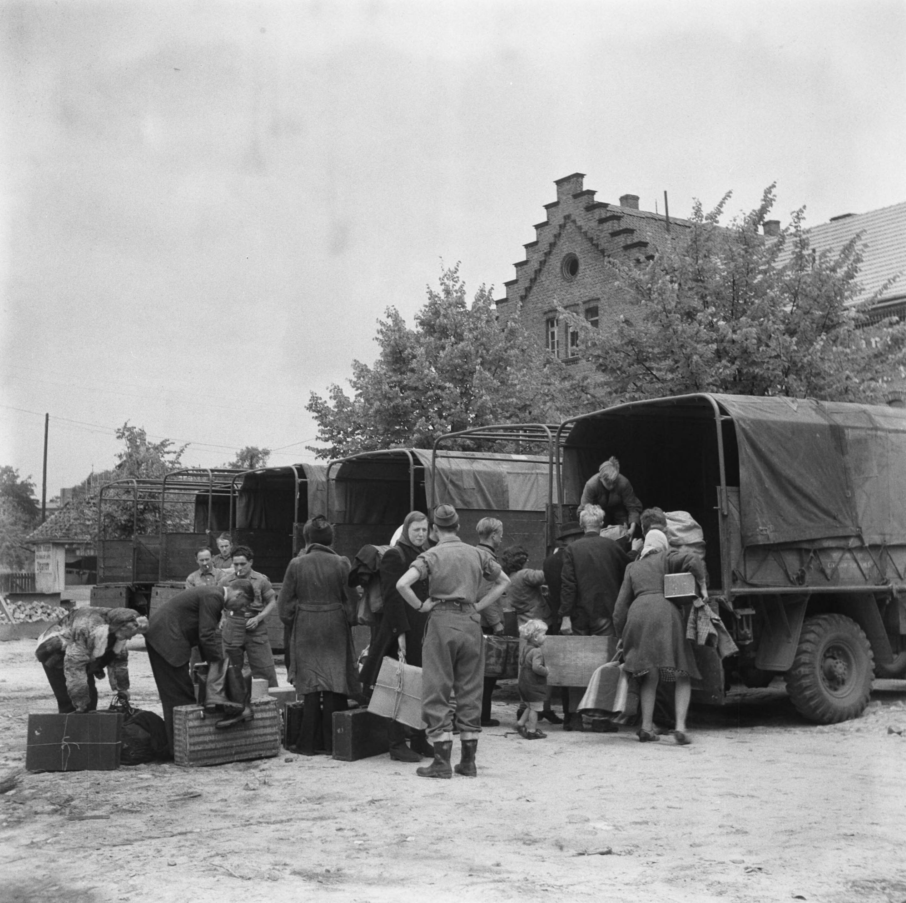 Repatrianten bij gereedstaande vrachtwagens