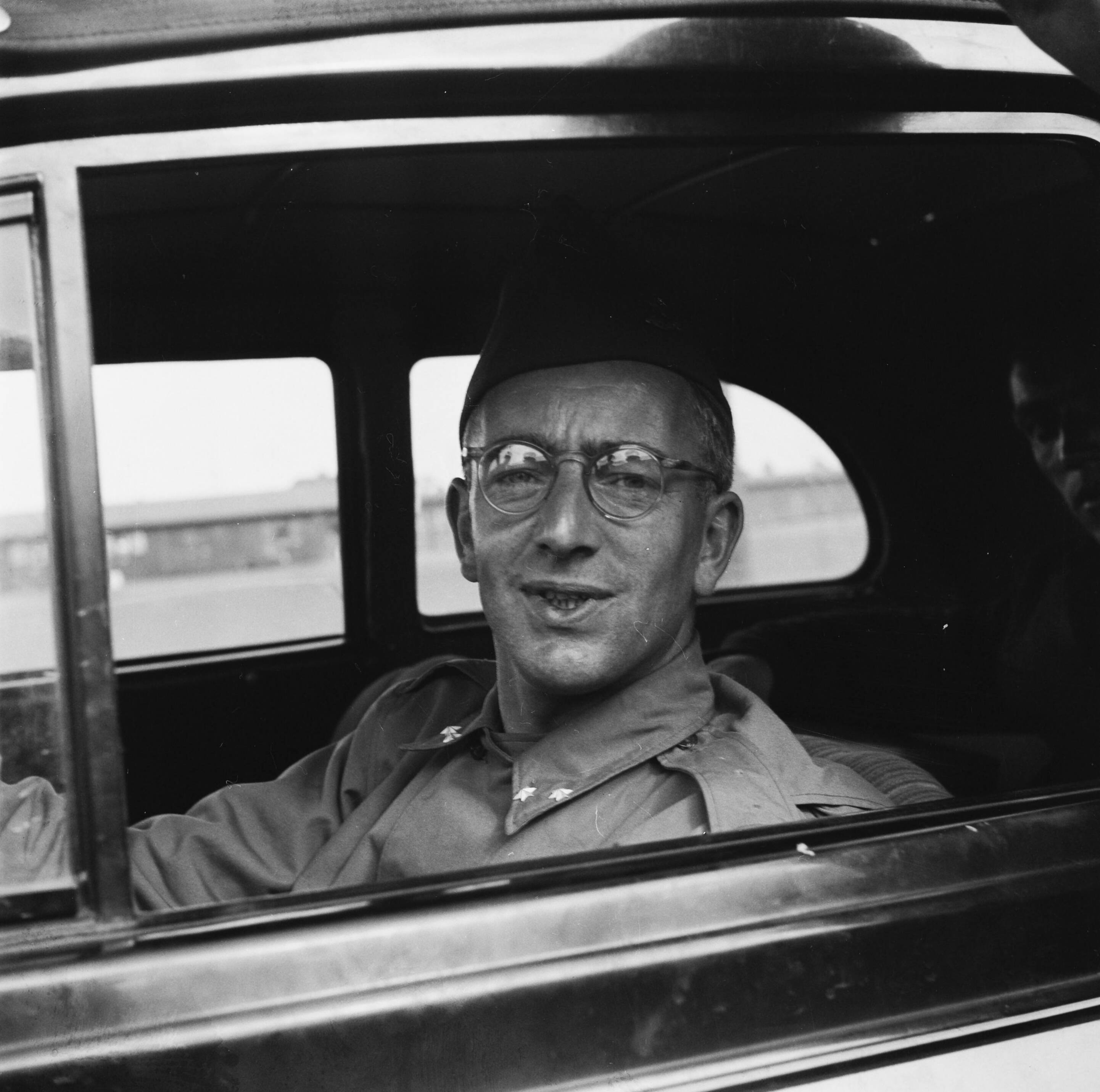 Een 1ste luitenant kijkt vanuit het zijraam van een auto