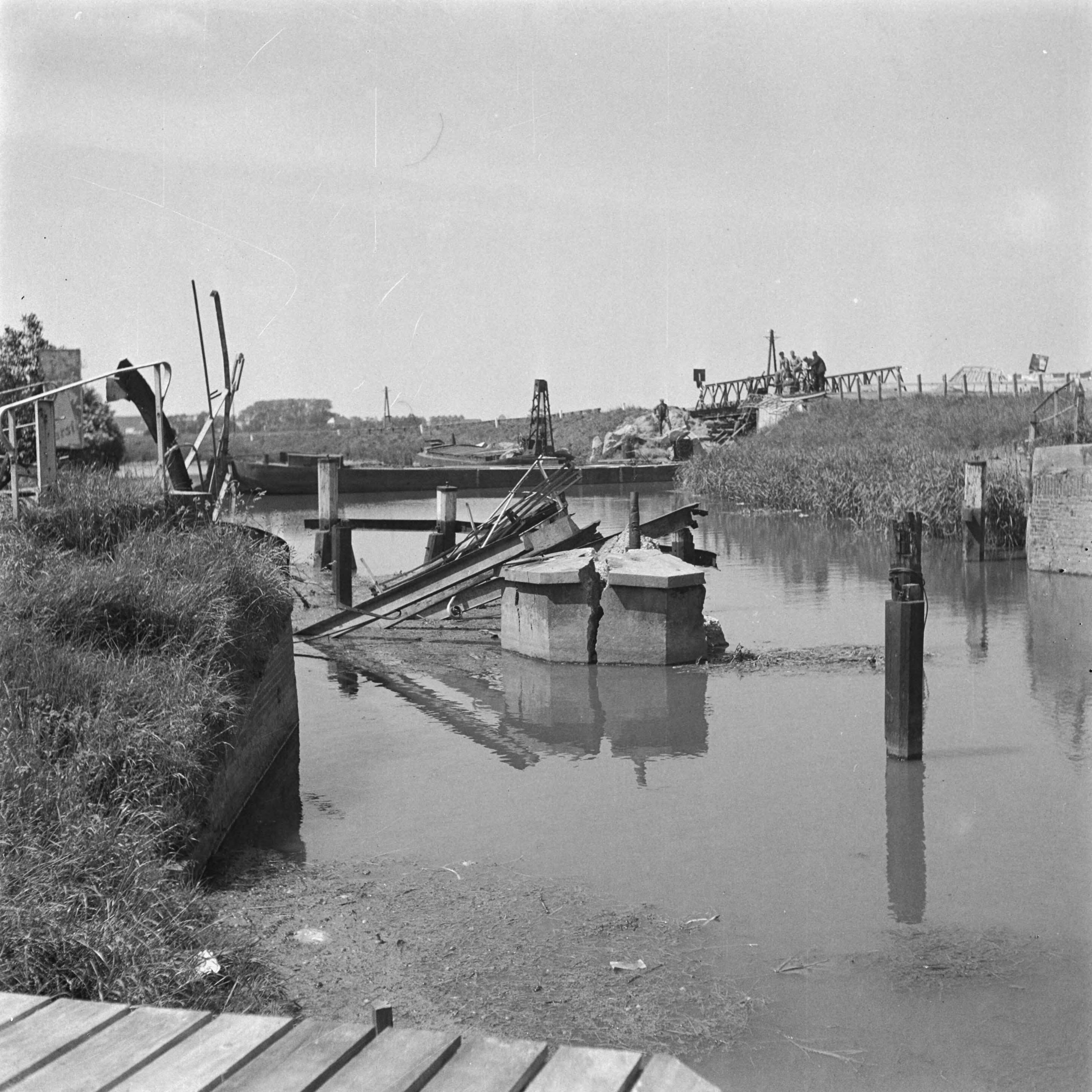 vernielde brug over kanaal met pontons en arbeiders bezig met herstellingswerk