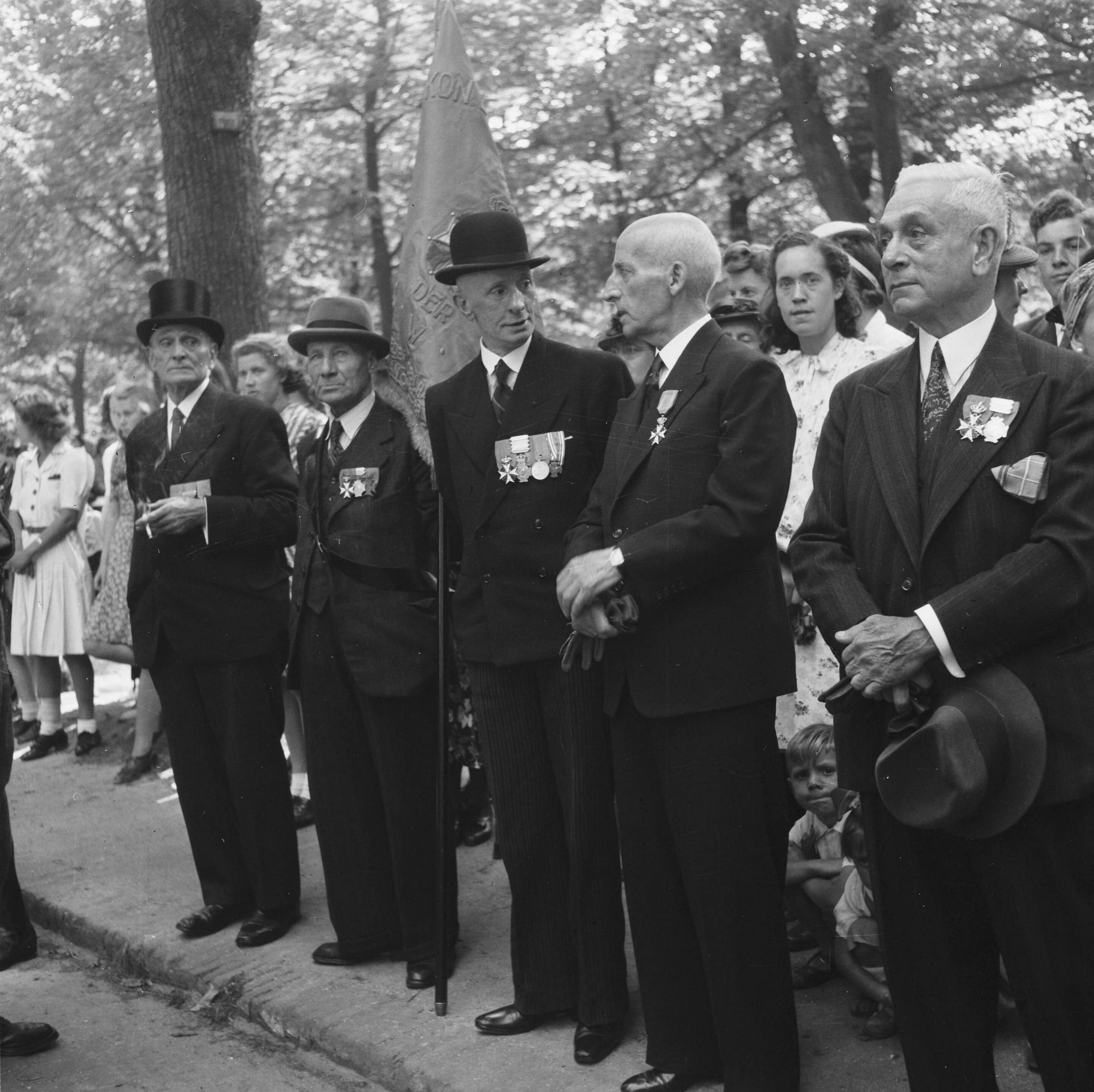 Parade over het Lange Voorhout. Heren in burgerkleding met onderscheidingen op hun borst