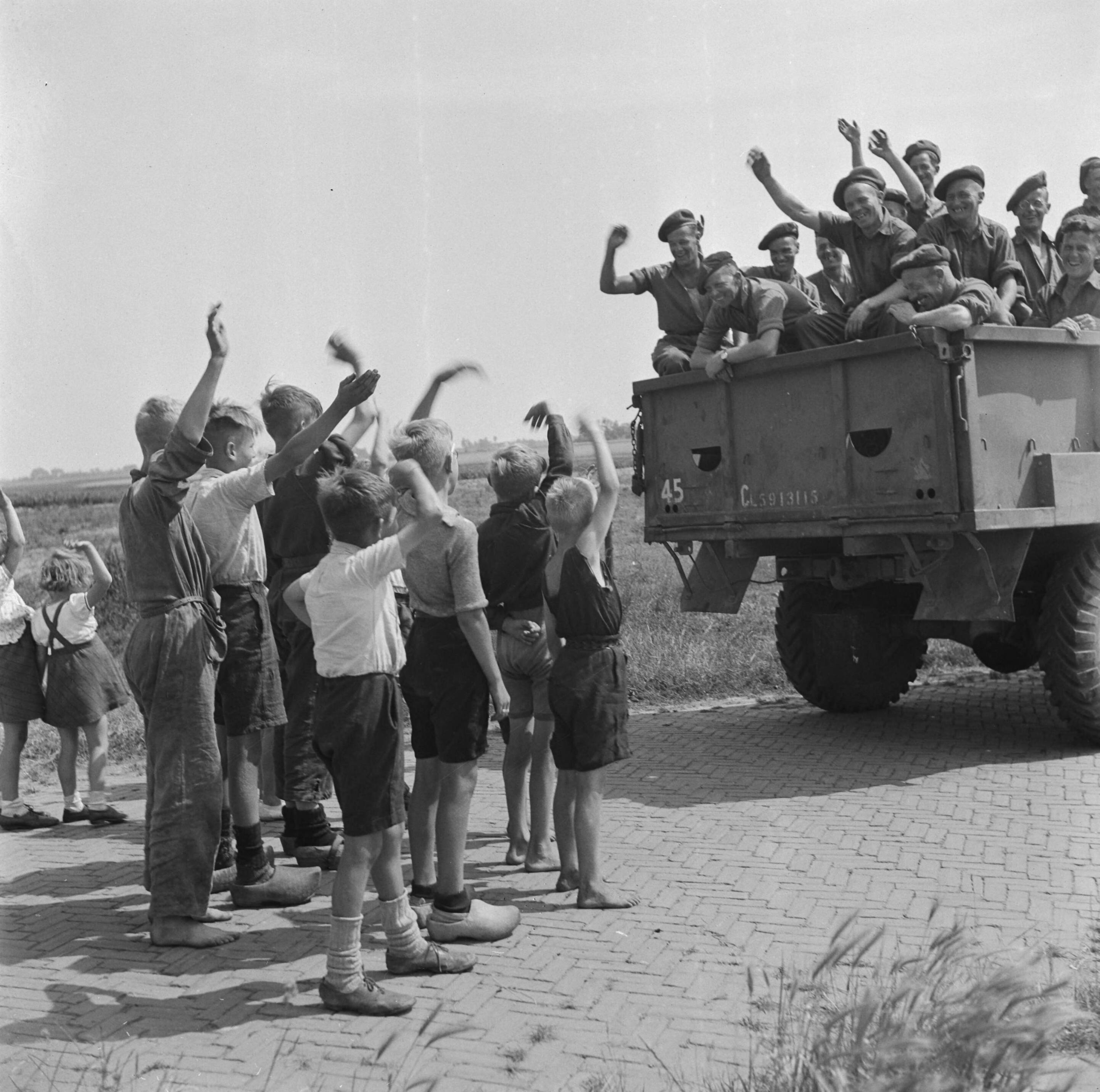 Canadese militairen in de laadbak van een vrachtwagen zwaaien naar kinderen