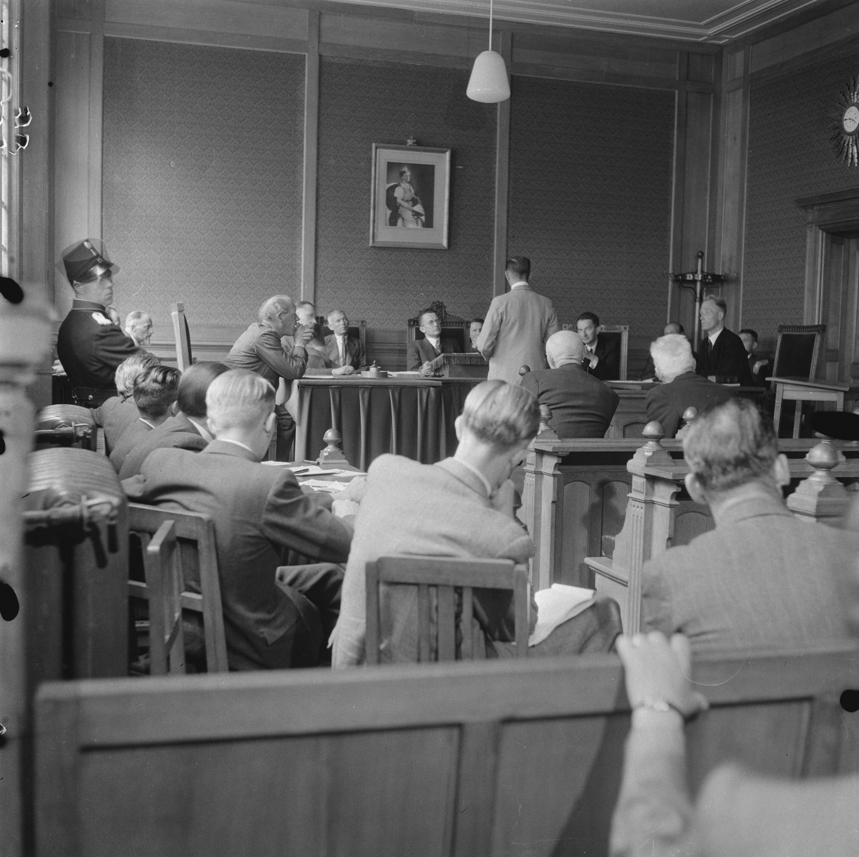 Zicht op de leden van het Tribunaal. Links een politie-agent