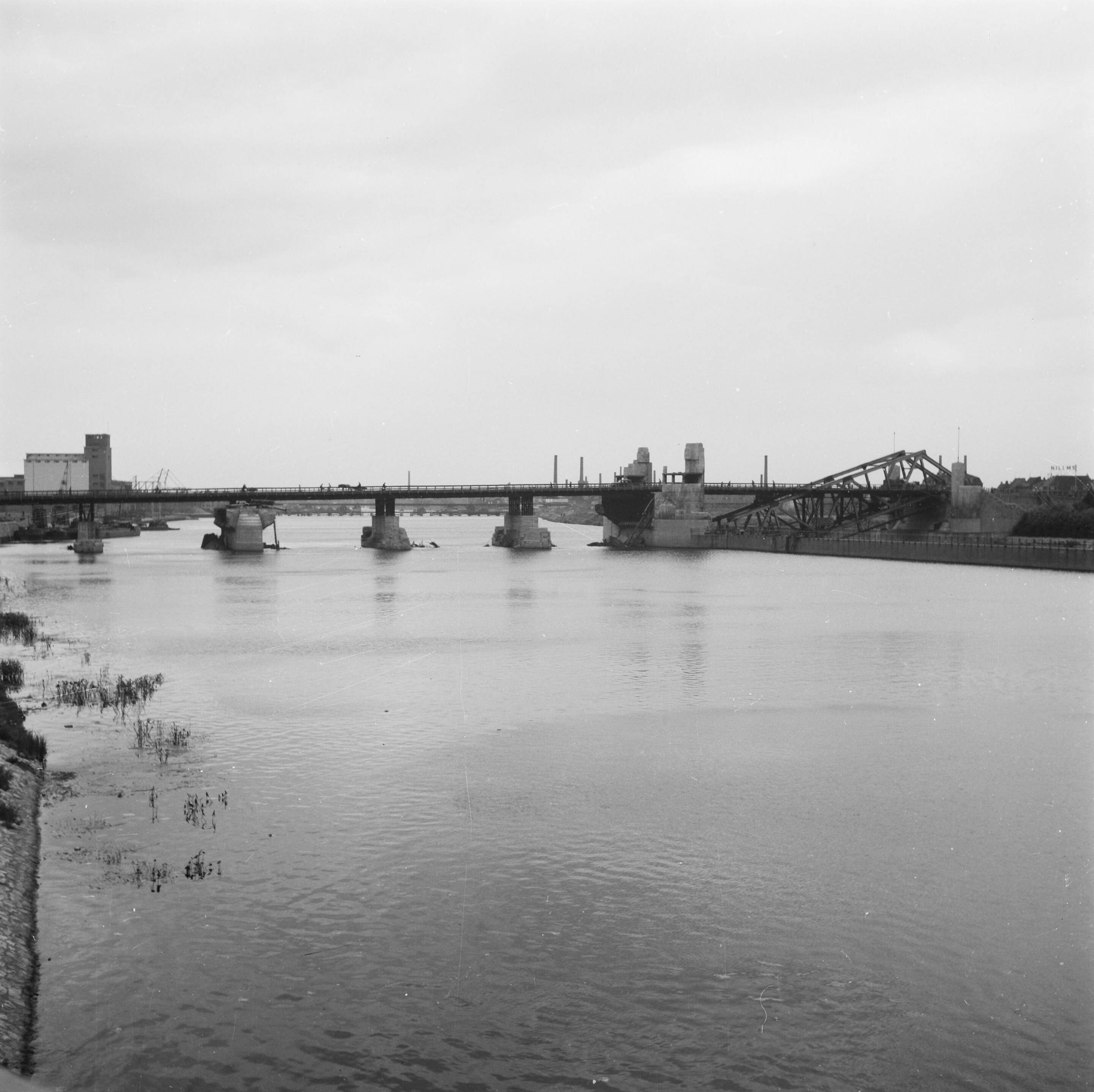 Noodbrug aangelegd over de vernielde Wilhelminabrug over de Maas in Maastricht