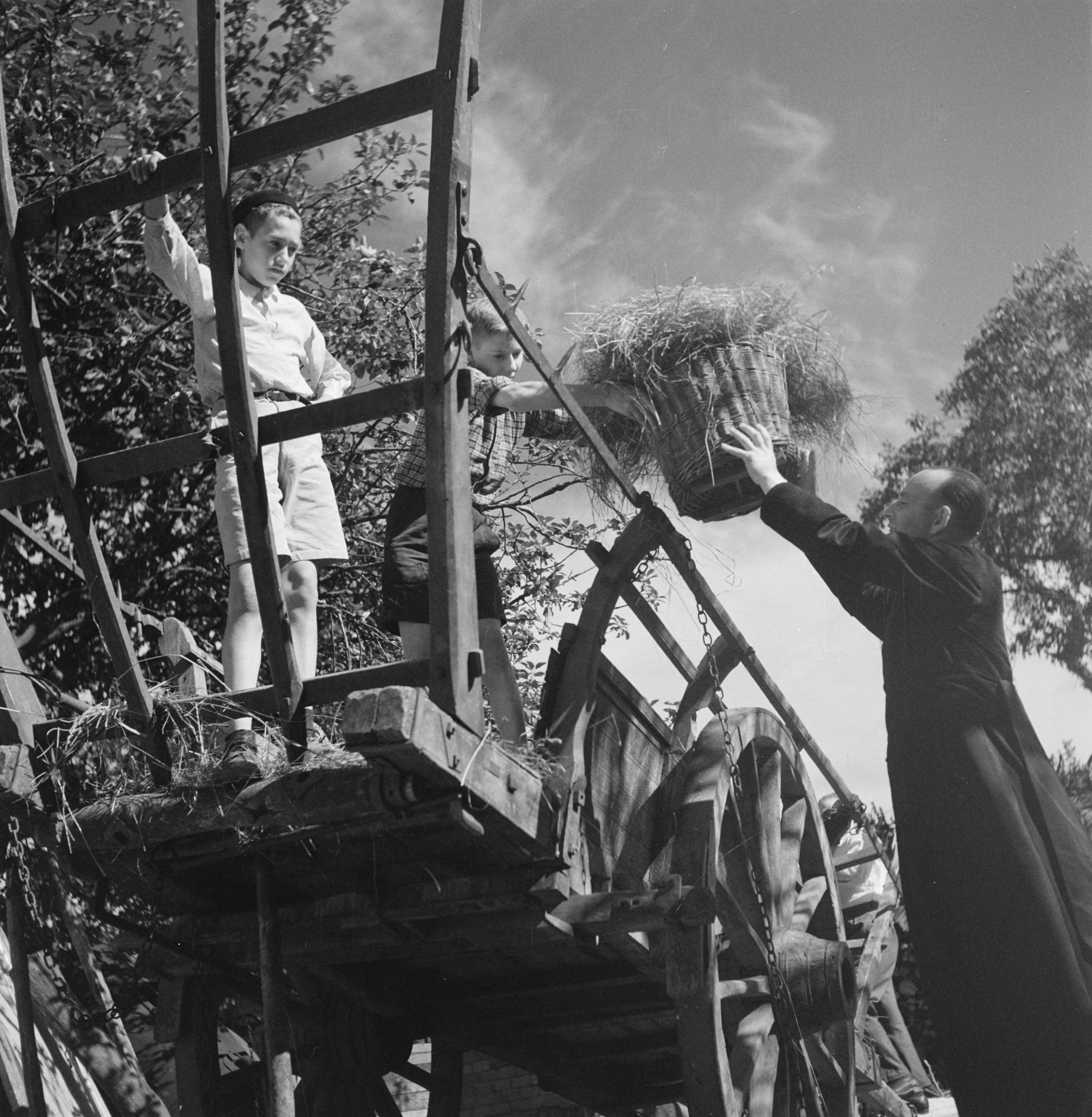 Twee jongens staan op een boerenkar. Een priester reikt een mand met hooi? aan