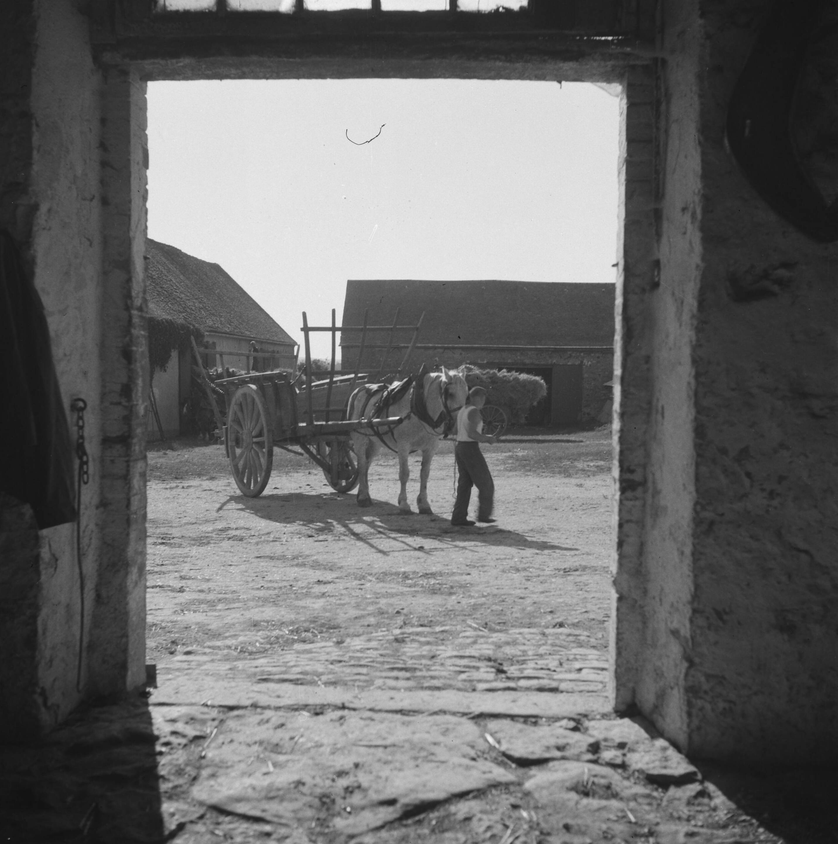 Doorkijk vanuit boerderij naar binnenplaats met boerenkar