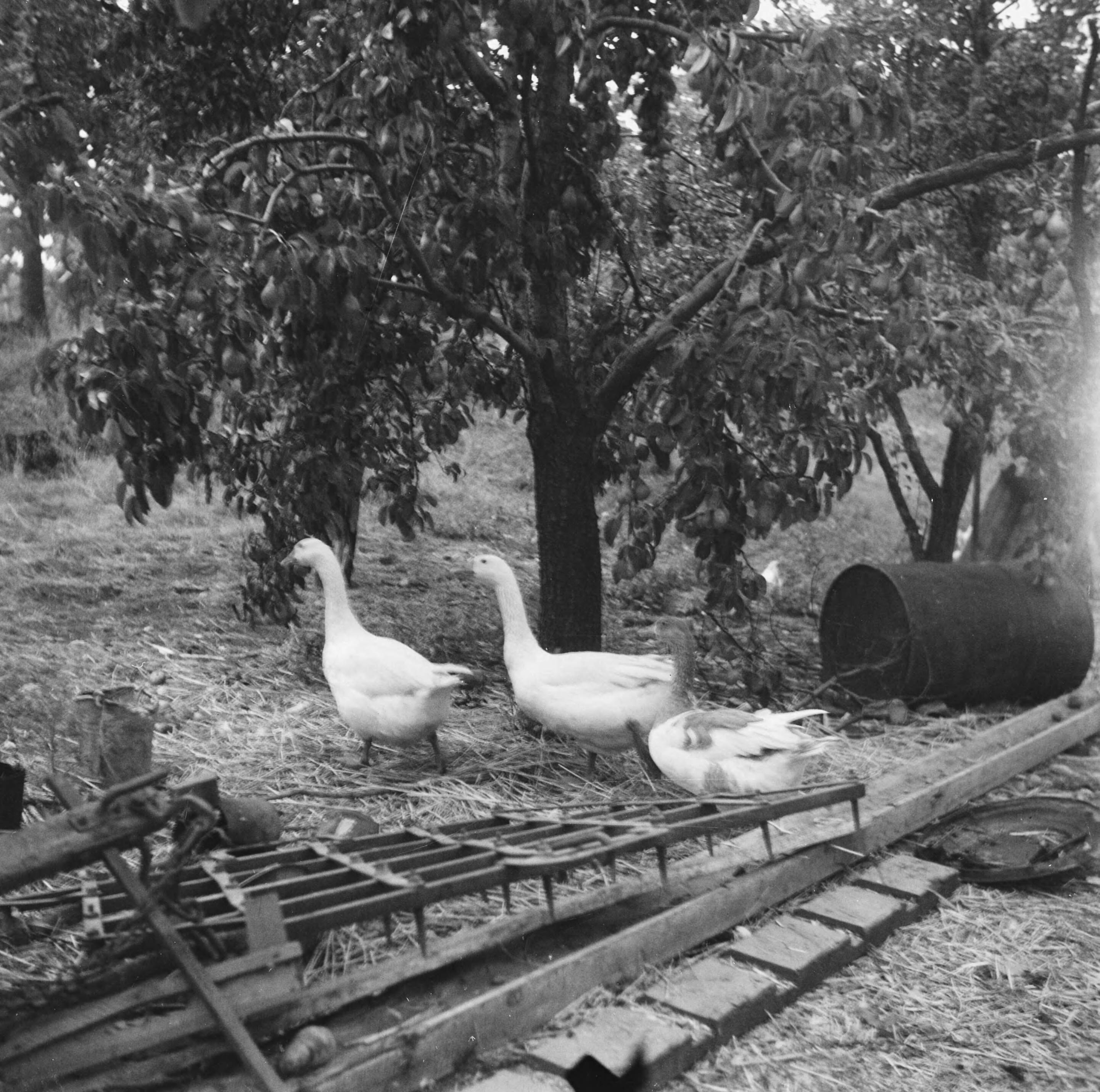 Annexatie Doorkijk naar erf boerderij met rondscharrelende ganzen en kippen