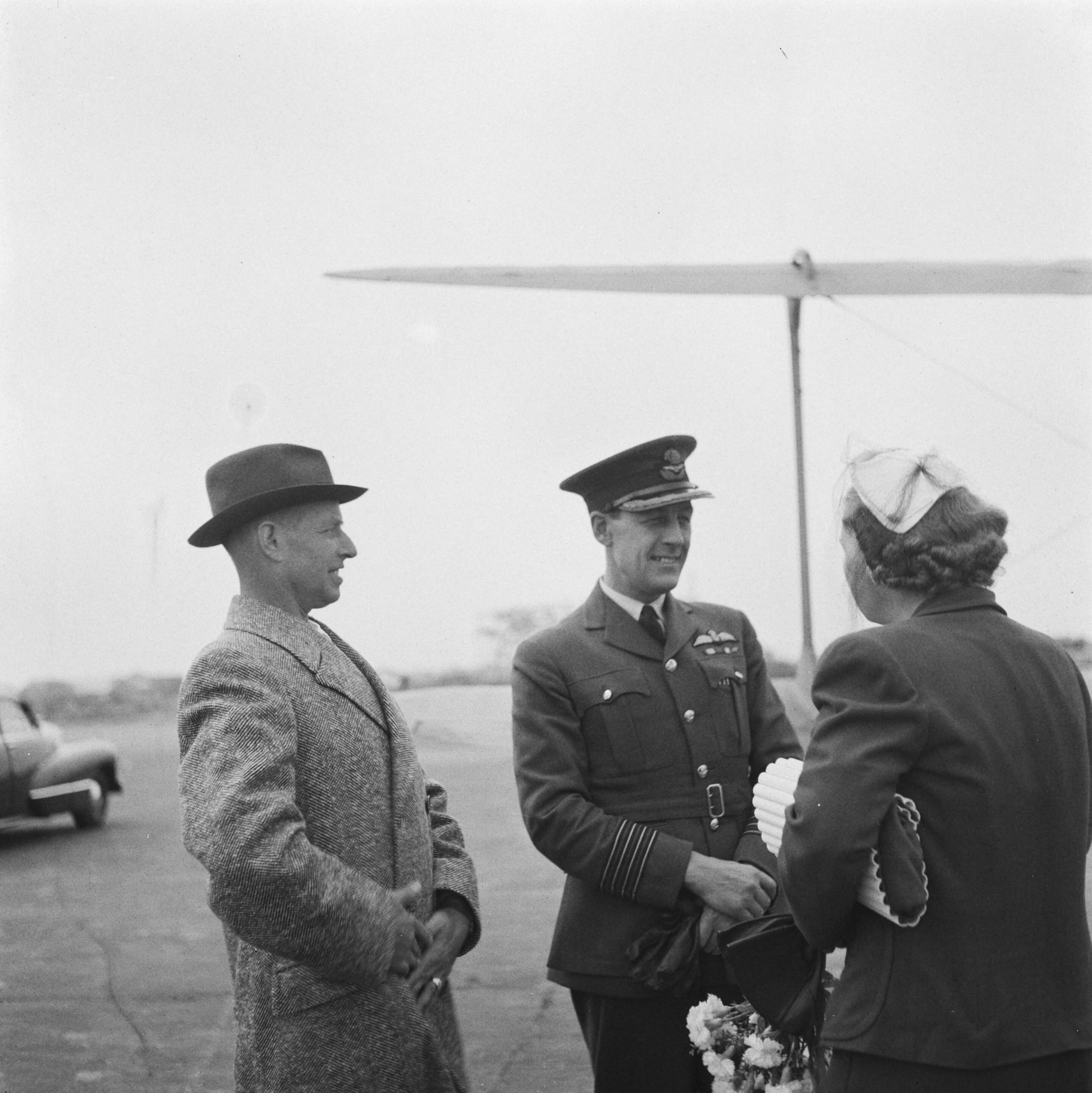 Gouverneur-generaal Tjarda van Starkenborg Stachouwer wordt op het vliegveld Schiphol begroet door prinses Juliana. Tussen hen in een luchtmachtofficier
