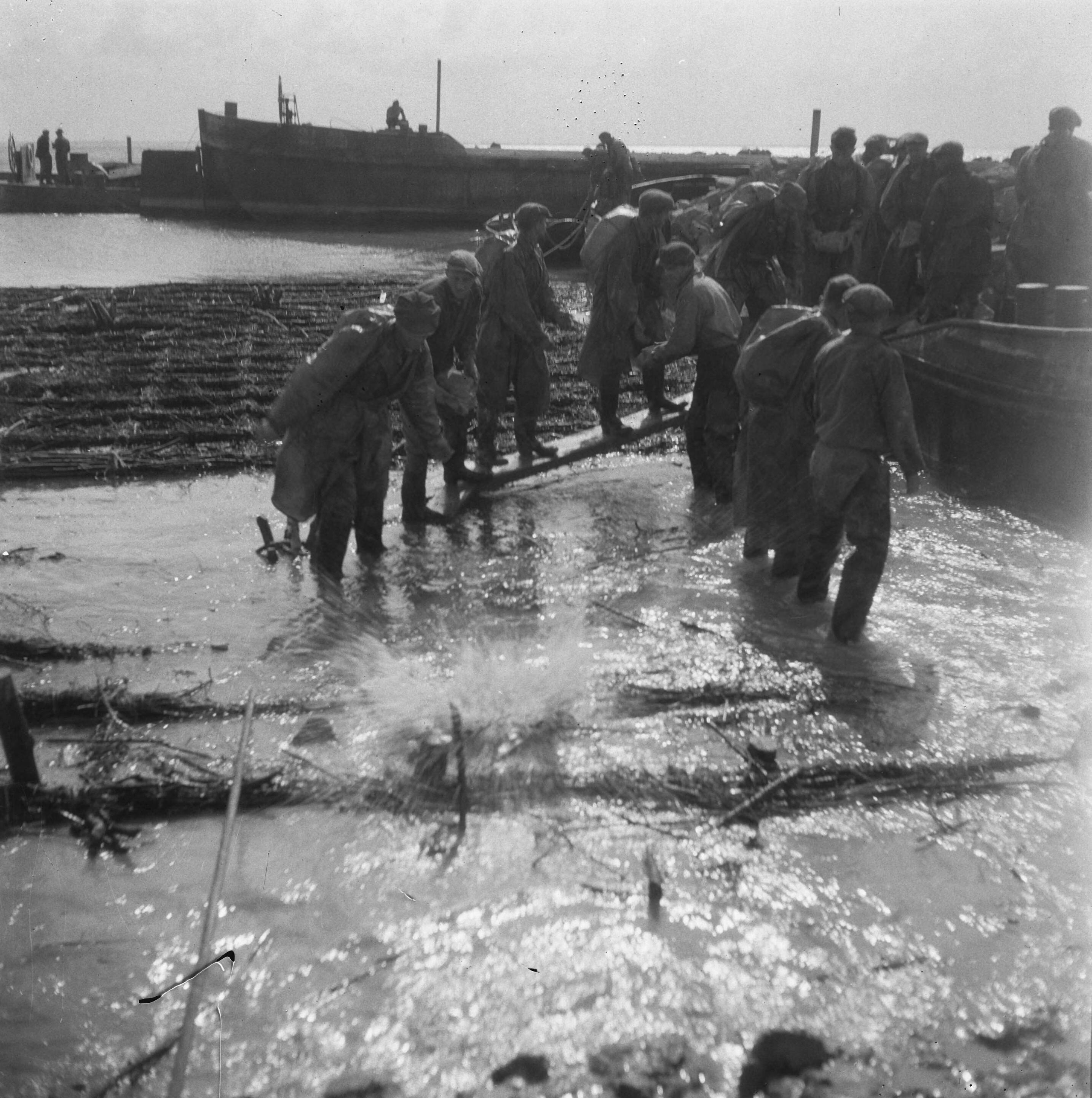 Arbeiders met zandzakken