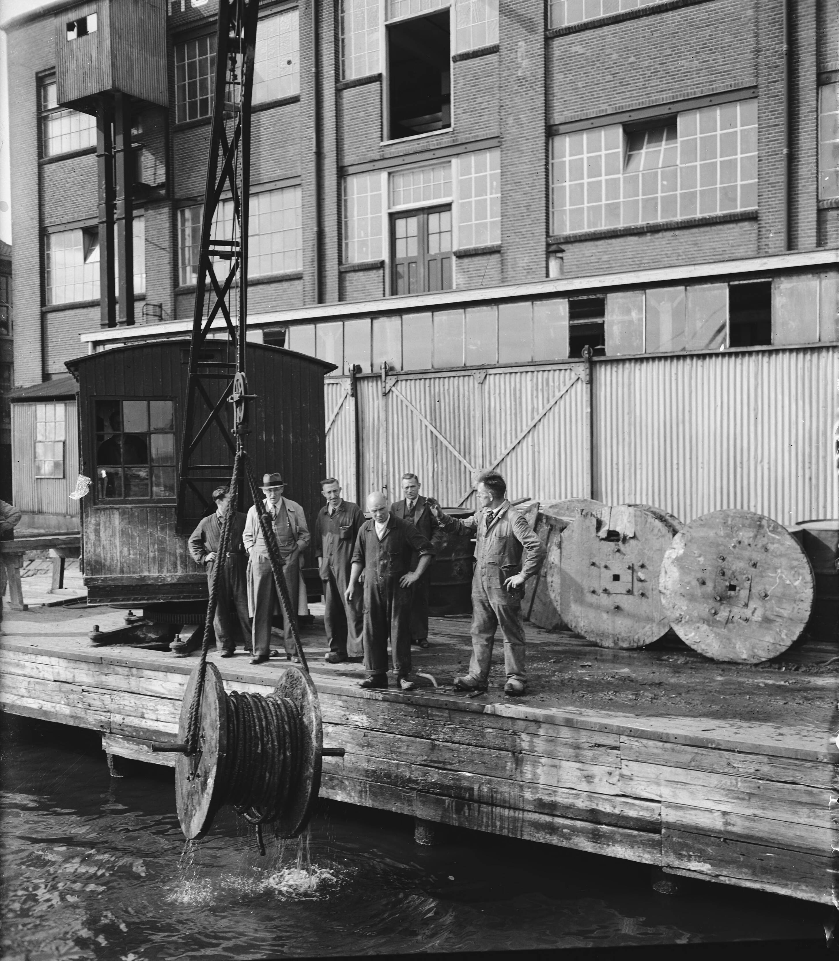 Het ophijsen van een ondergedoken kabelrol bij Draka fabrieken in Amsterdam