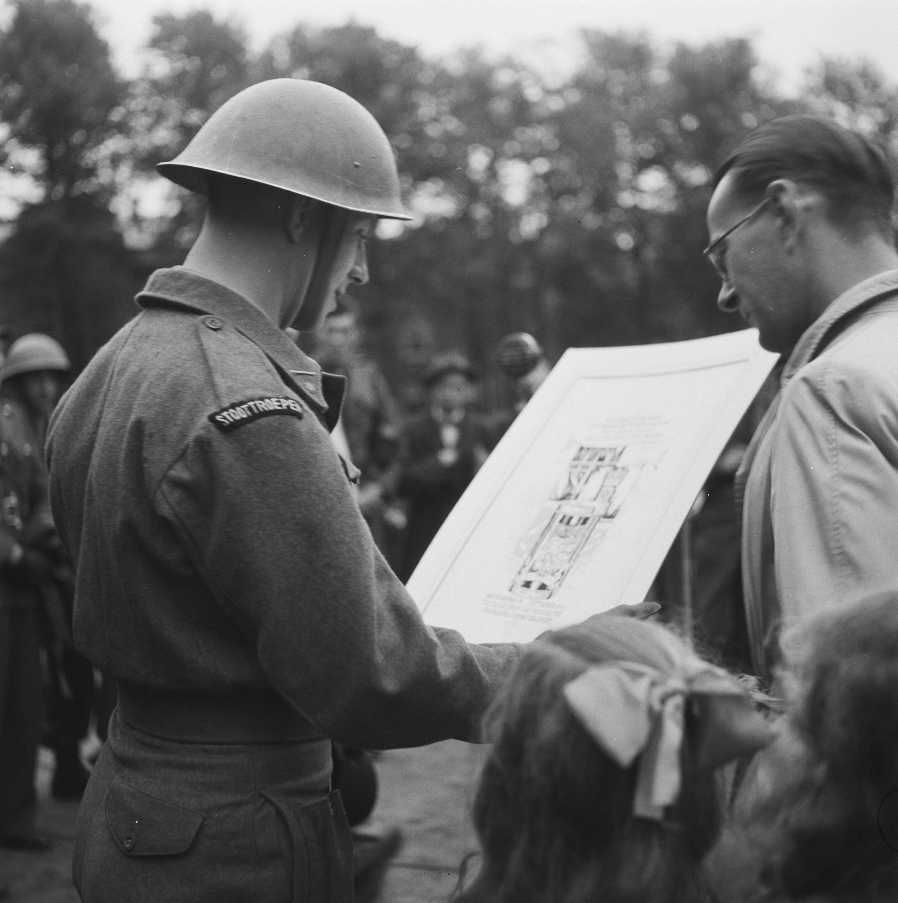Een majoor van het regiment Stoottroepen ontvangt een oorkonde