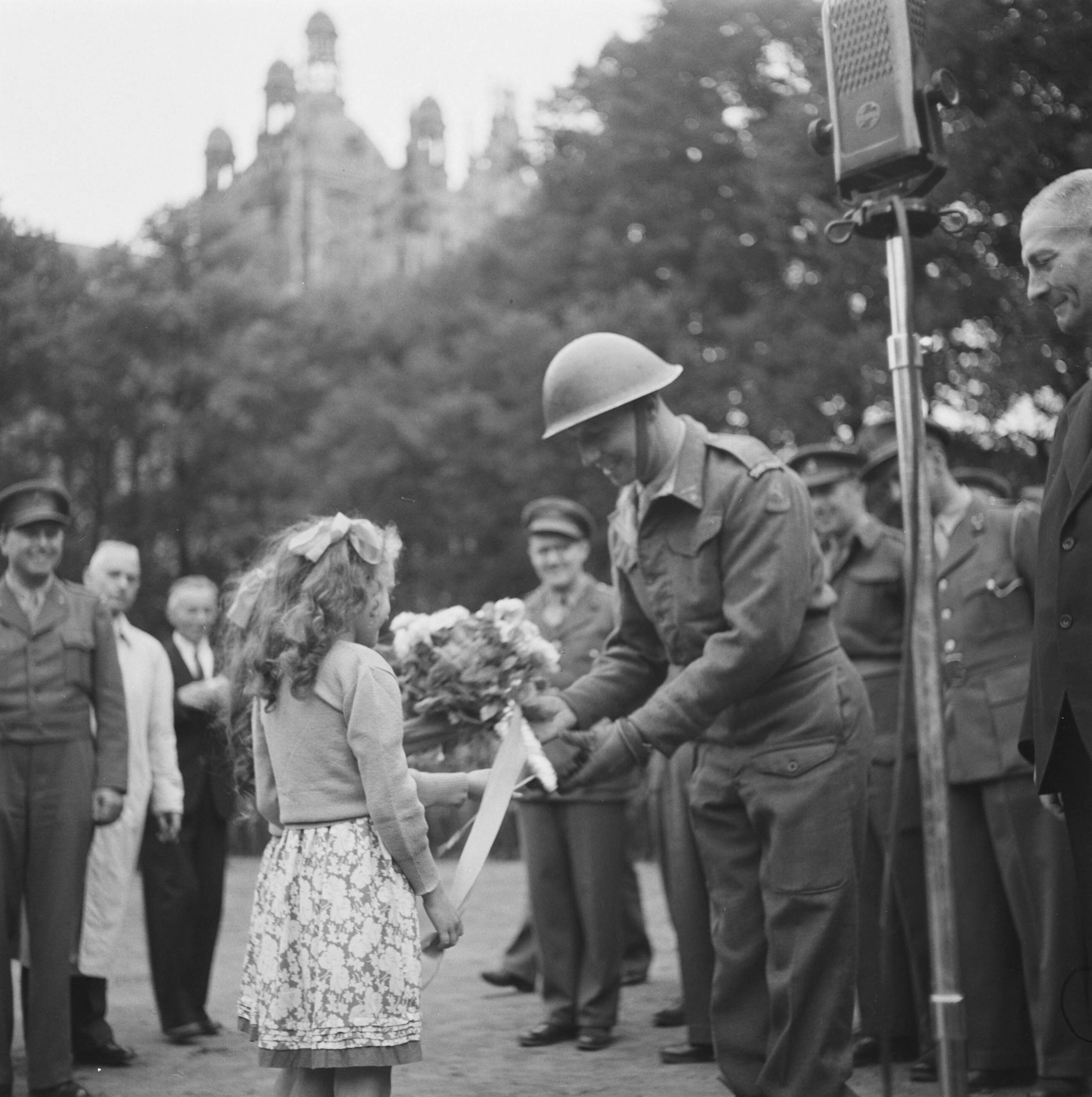 Twee meisjes bieden majoor van het regiment Stoottroepen een boeket bloemen en een voorwerp aan