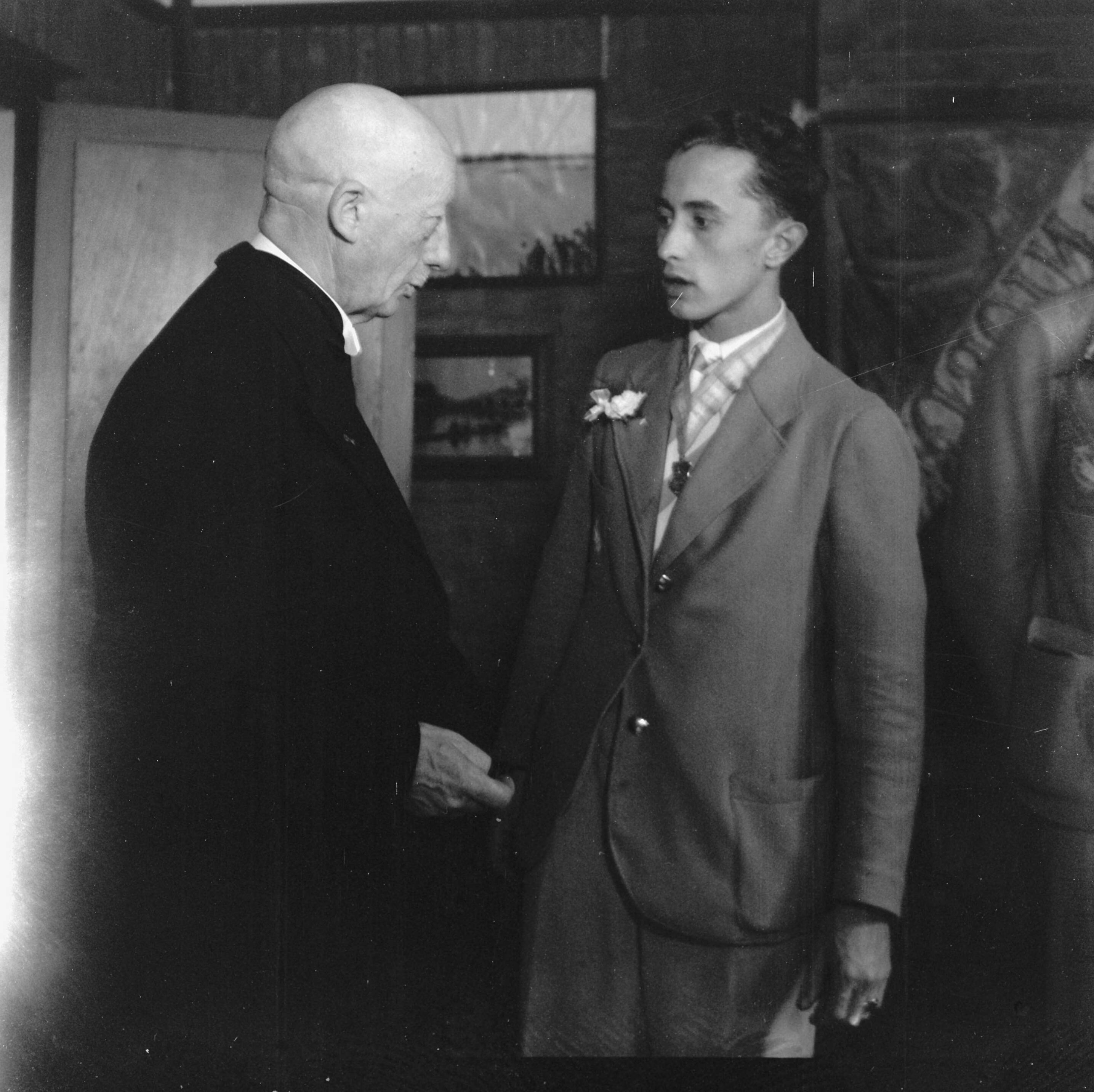 Oudere heer in gesprek met een lid van de roeivereniging Njord