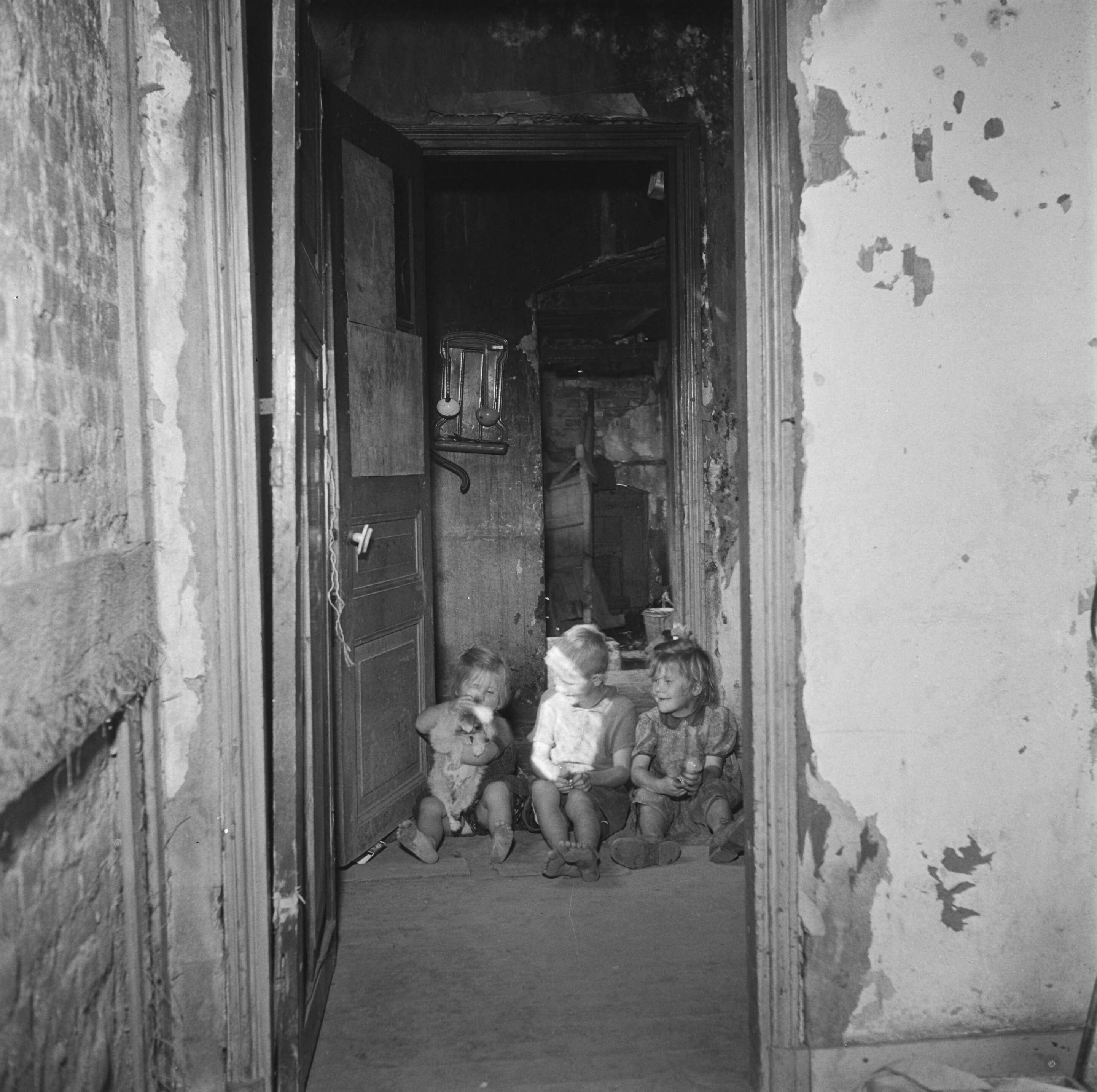 drie kleine kinderen zitten in de gang van een verwoest huis. Het linkermeisje houdt een klein hondje vast