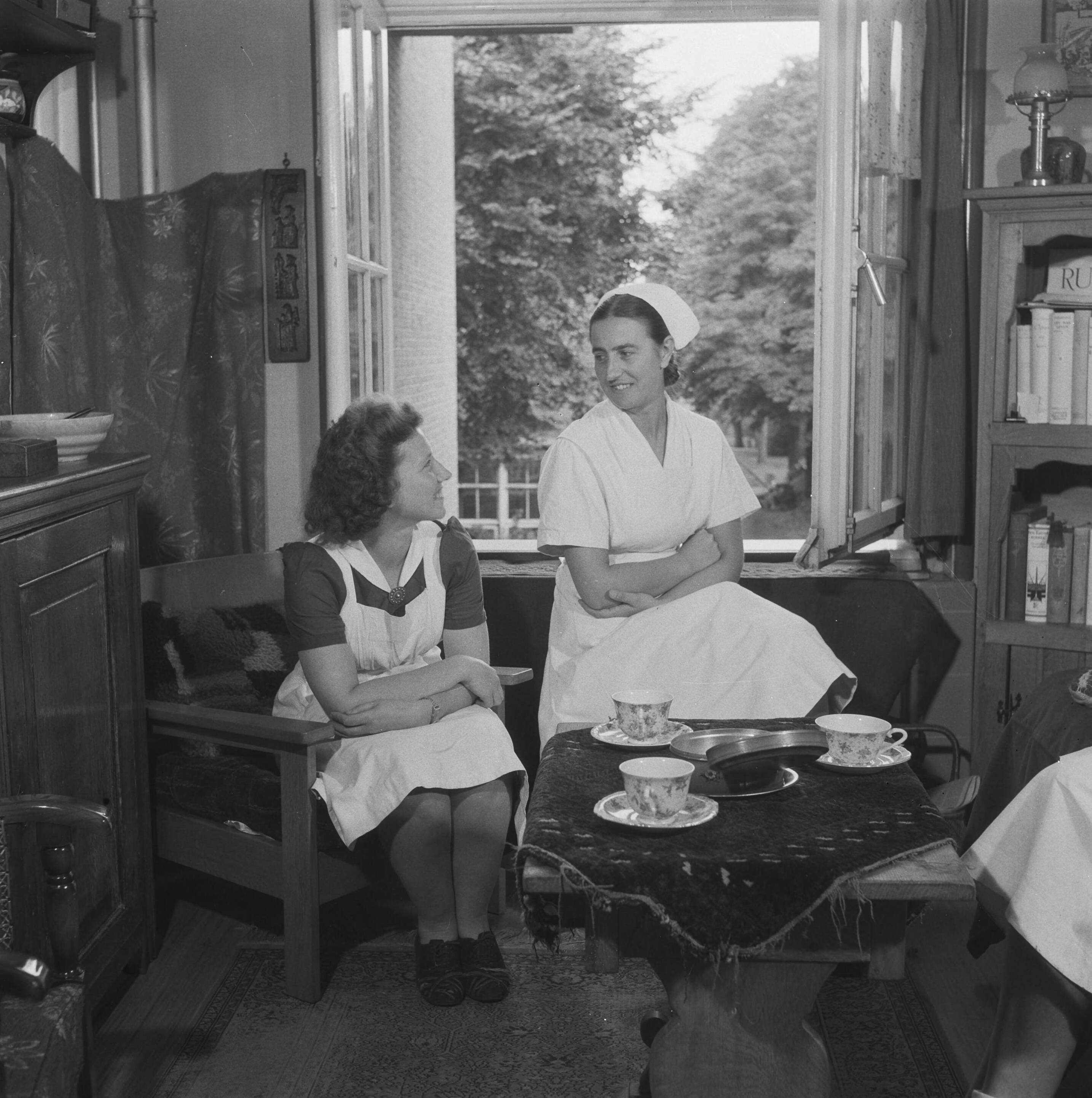 Twee verpleegsters in hun woonkamer tijdens theedrinken
