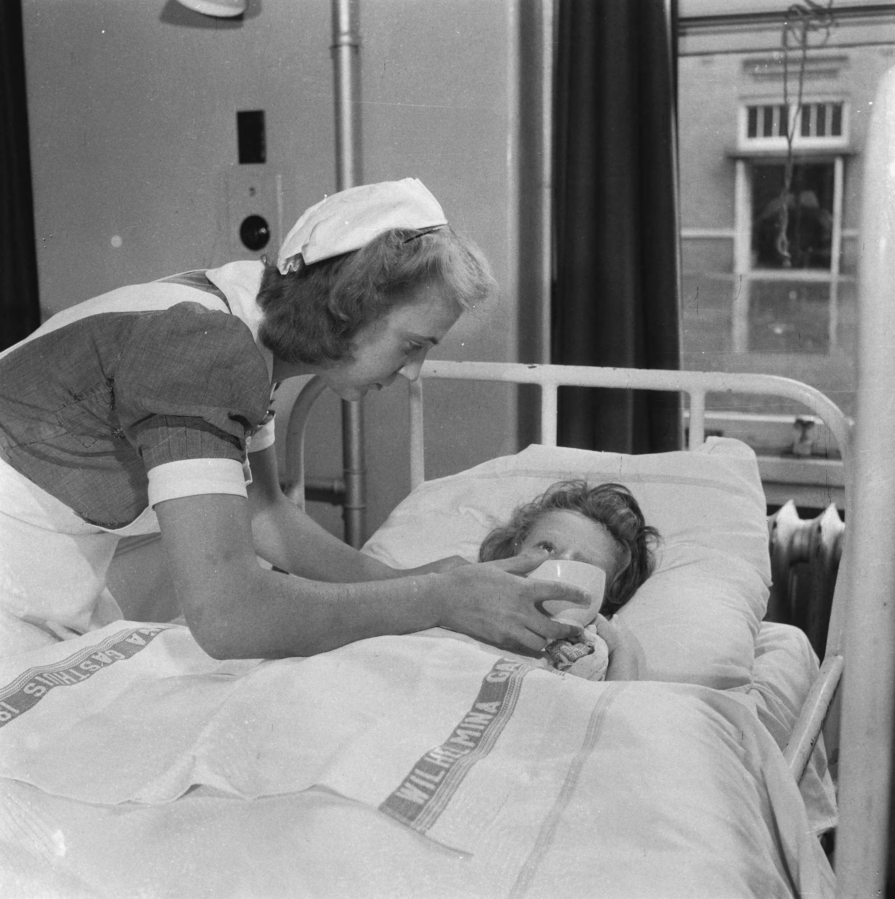 Een leerling-verpleegster geeft een kind te drinken