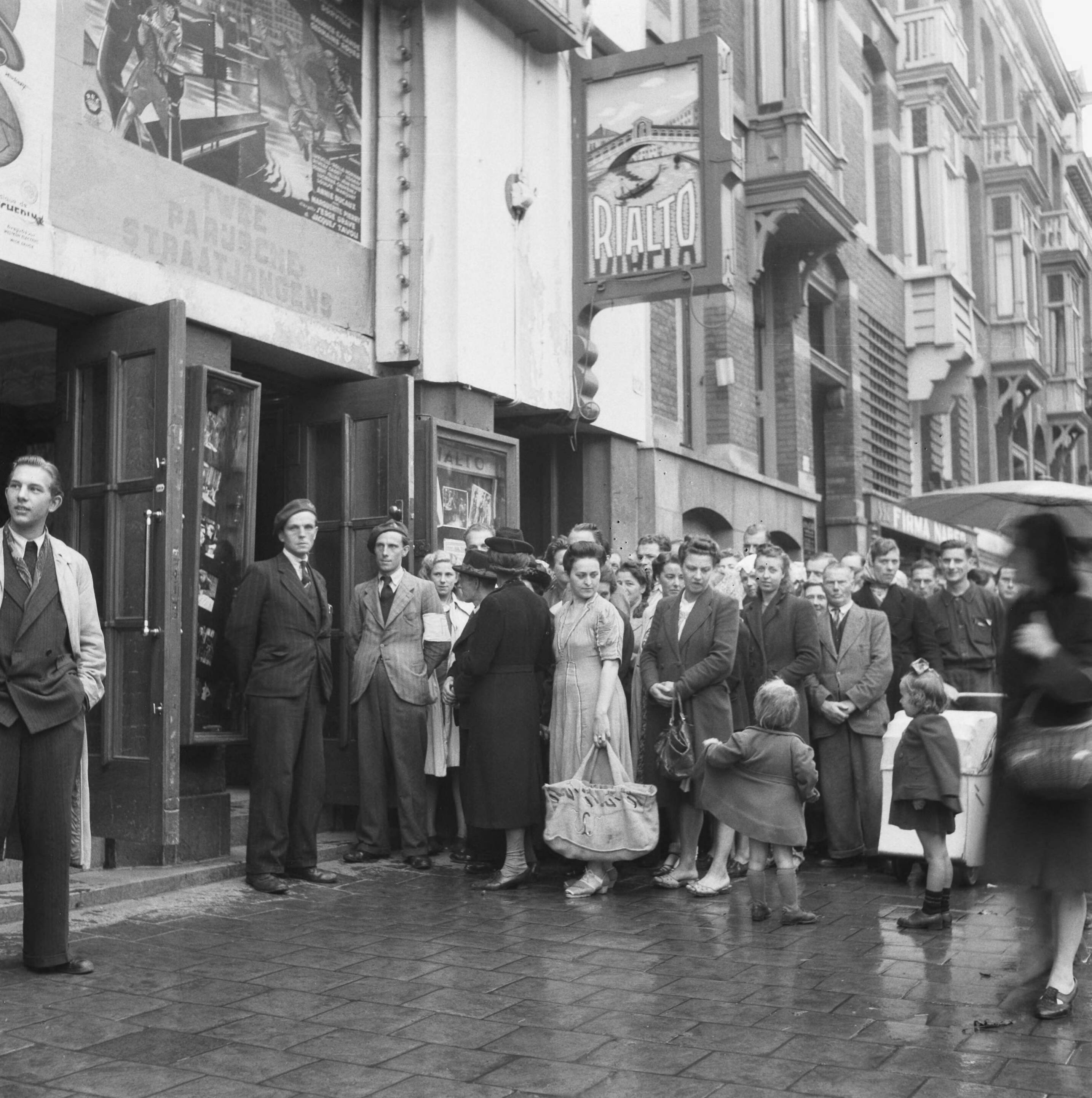 Kaartverkoop en rij wachtend publiek voor het Rialto-theater te Amsterdam