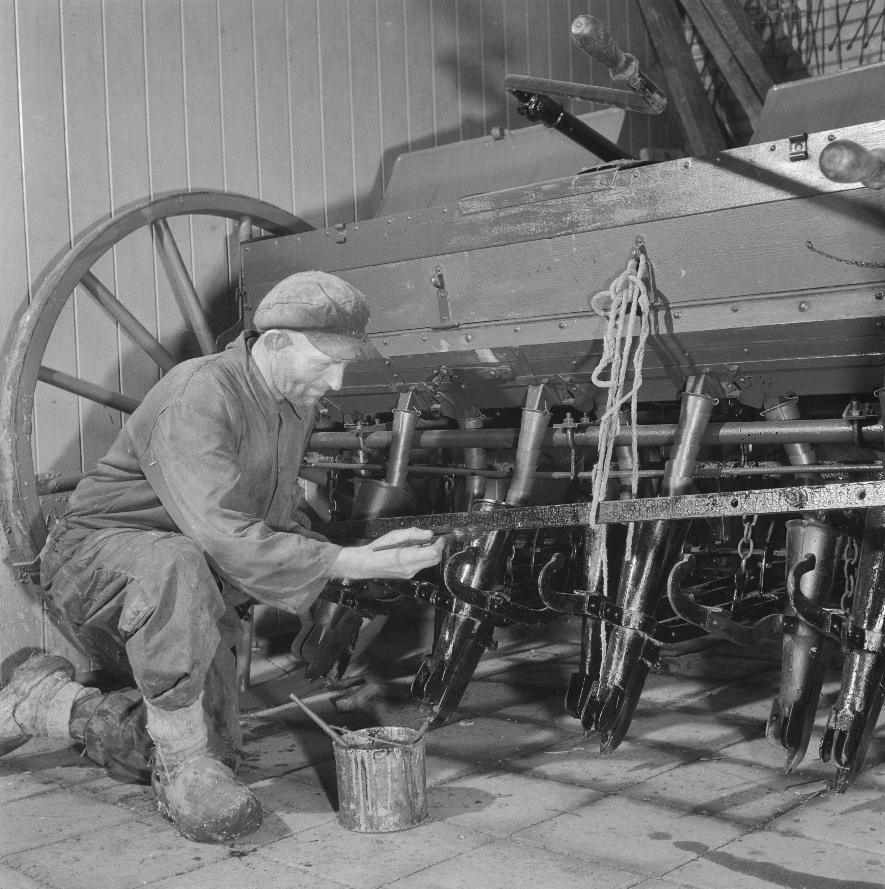 Drooglegging van de Wieringermeerpolder. Boer schildert landbouwwerktuig