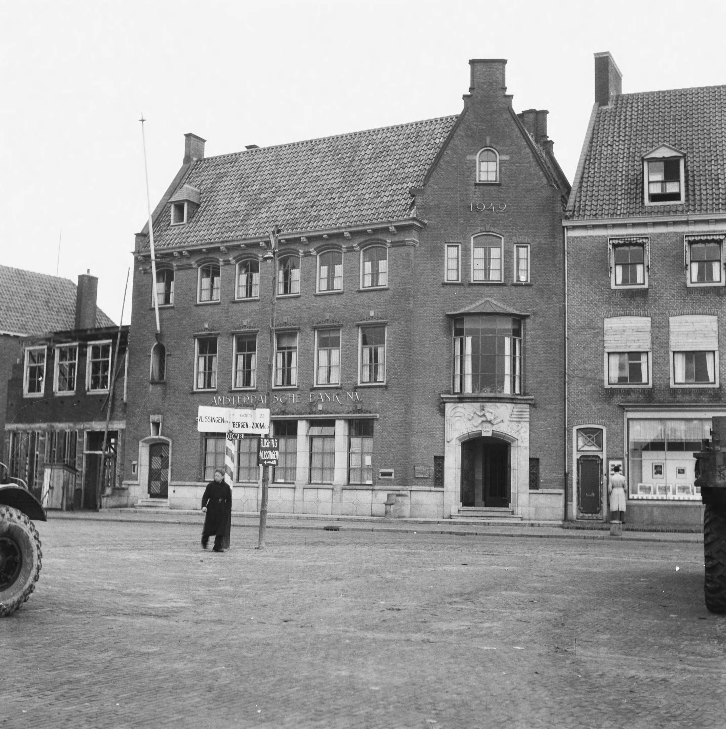 De Markt te Middelburg. In de achtergrond het gebouw van de Amsterdamsche Bank (gebouwd 1942)