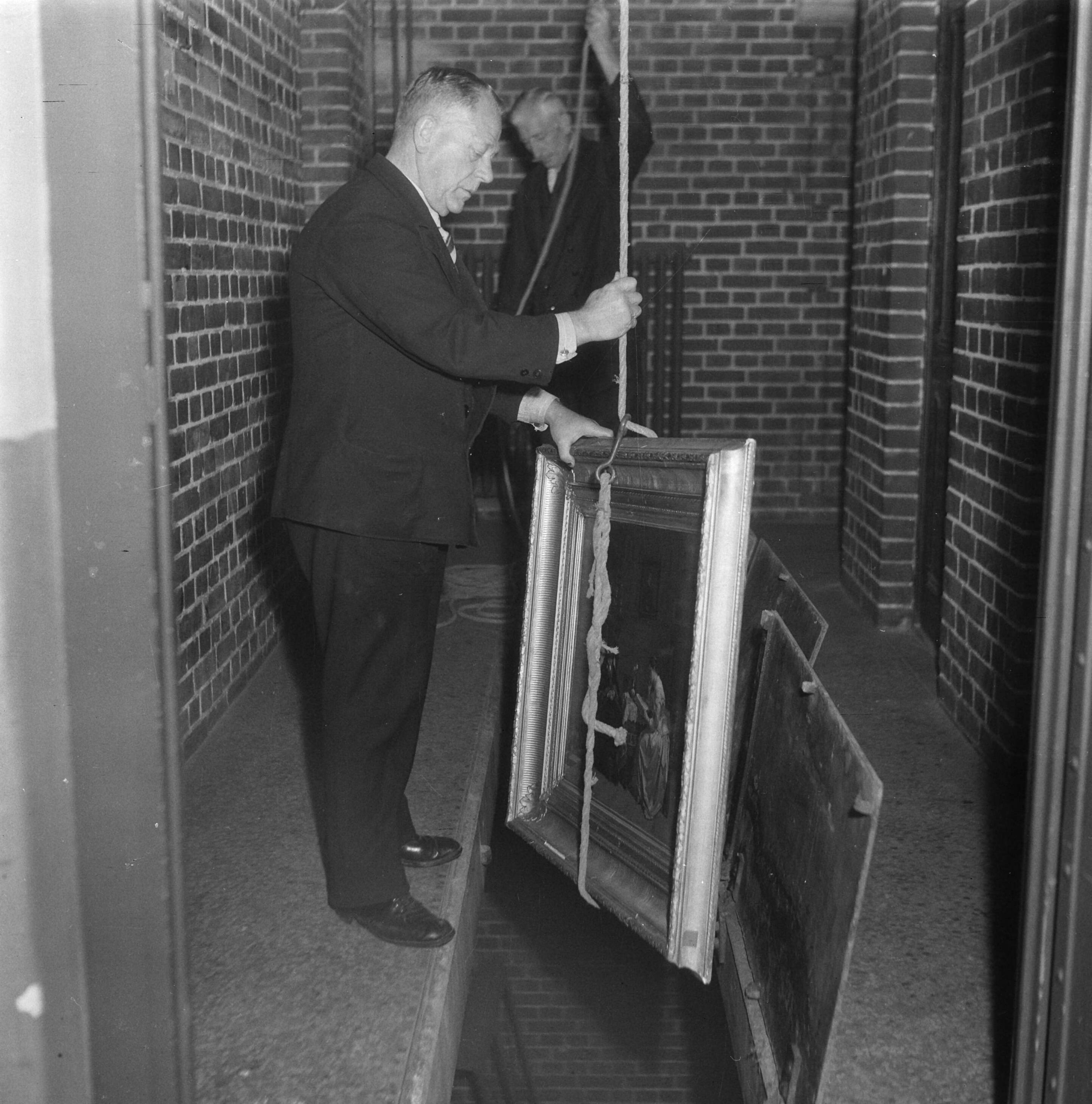 Door gleuven worden de schilderijen naar hun plaats getakeld