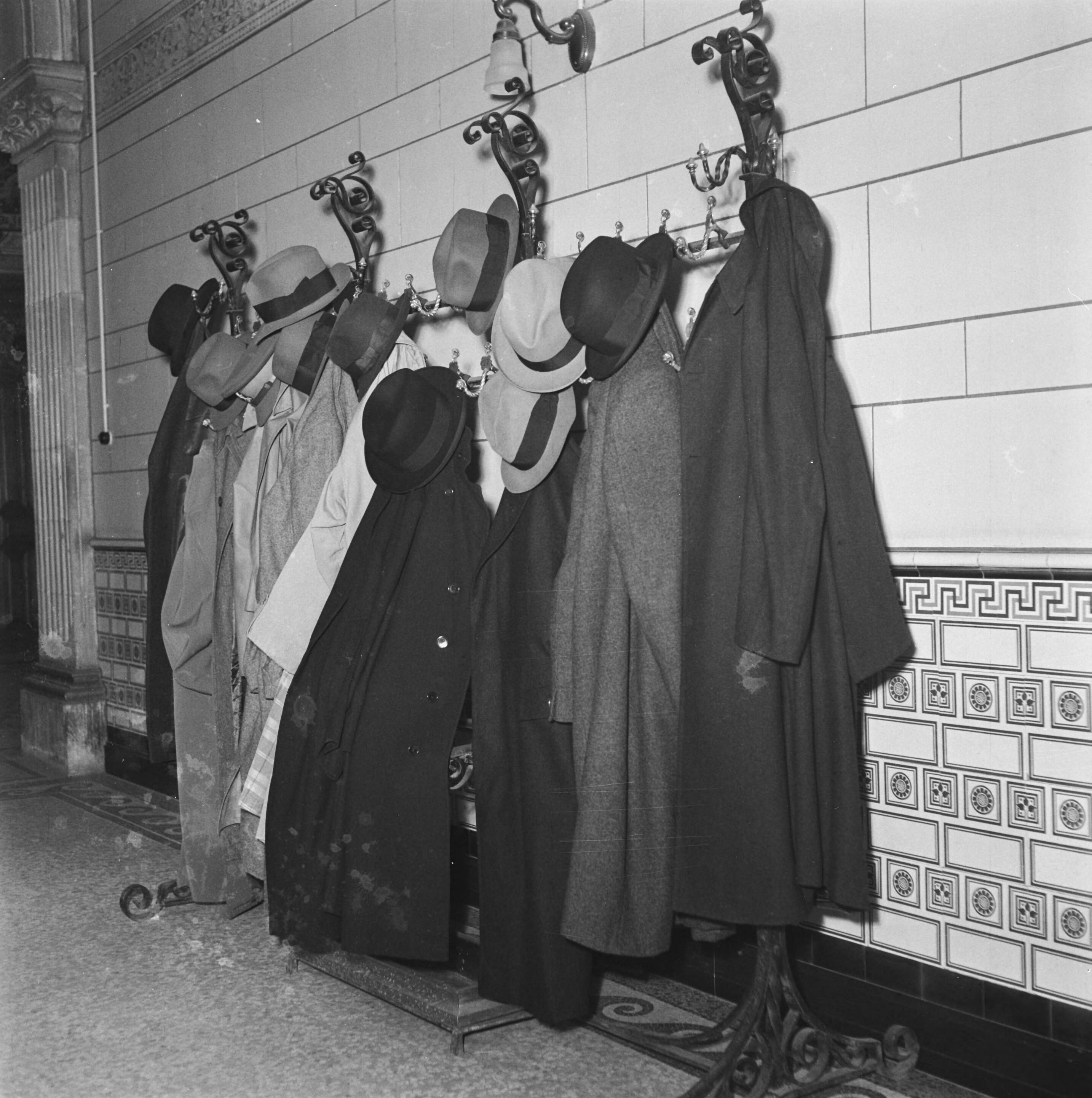 Ministerraad. De jassen en hoeden van de ministers in de garderobe