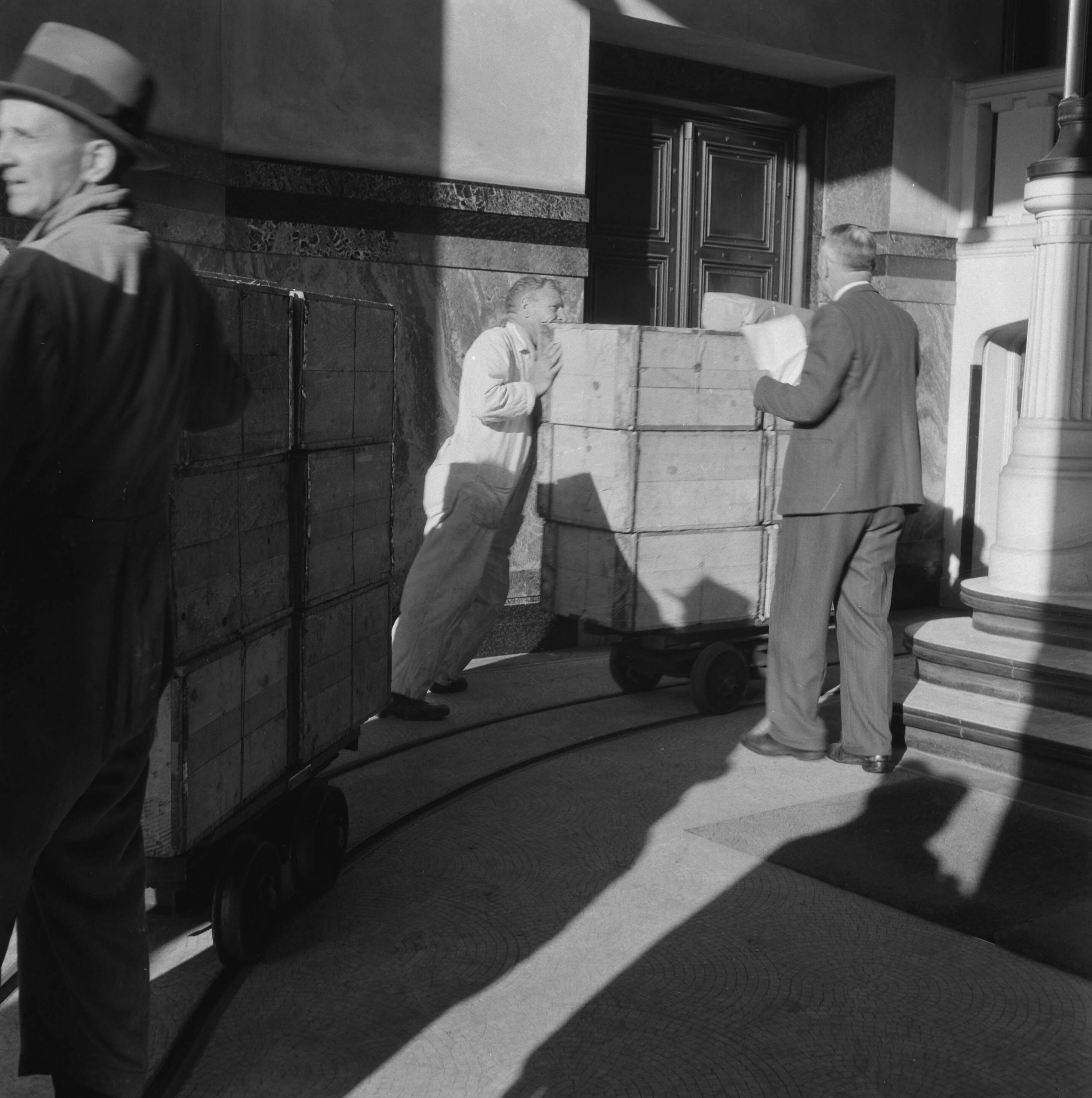 Kisten worden op lorries en smalspoor het gebouw van de Nederlandsche Bank ingereden