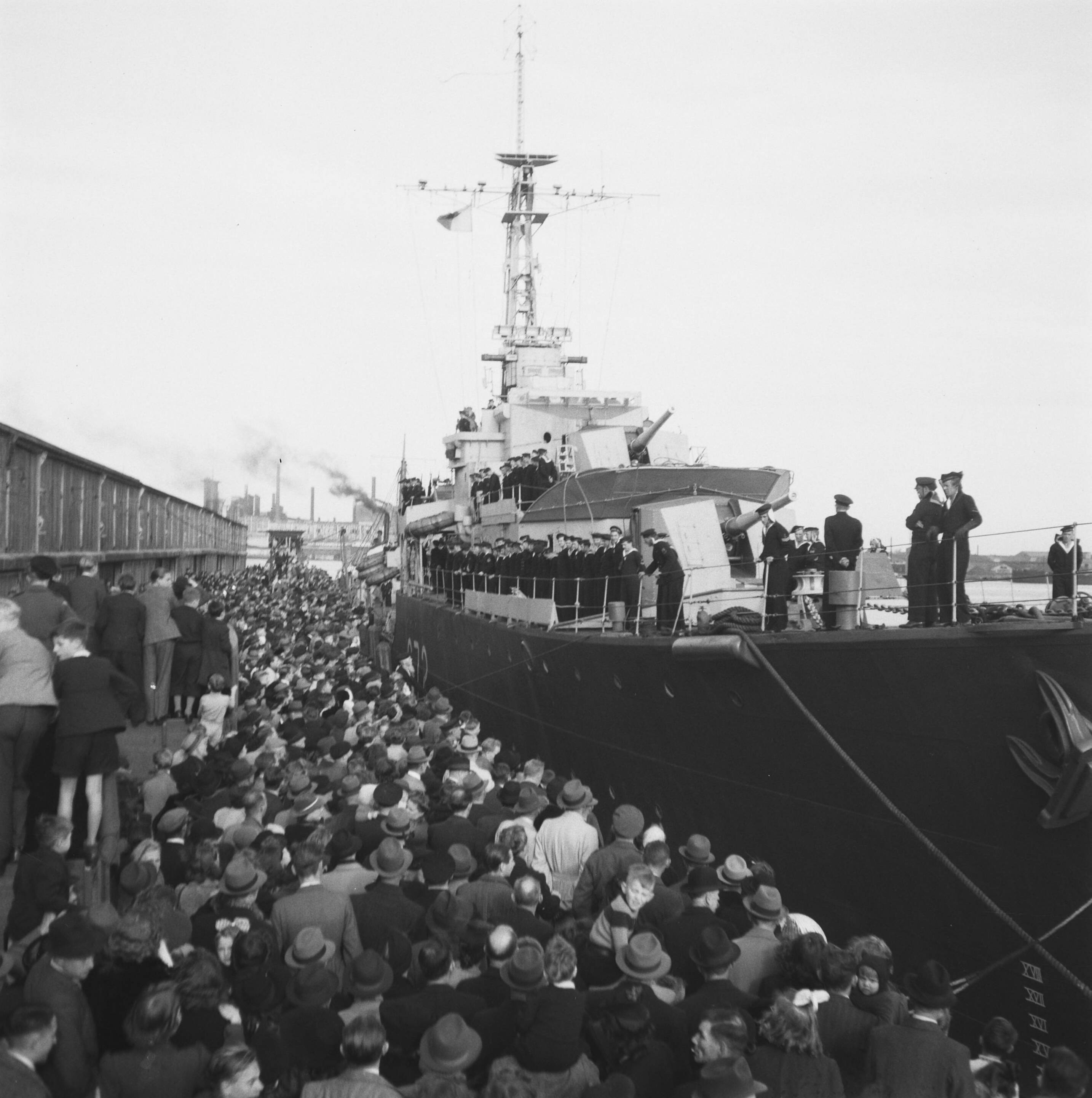 Hr. Ms. "Kortenaer" meert aan. Publiek aan de kade. Opvarenden staan aangetreden