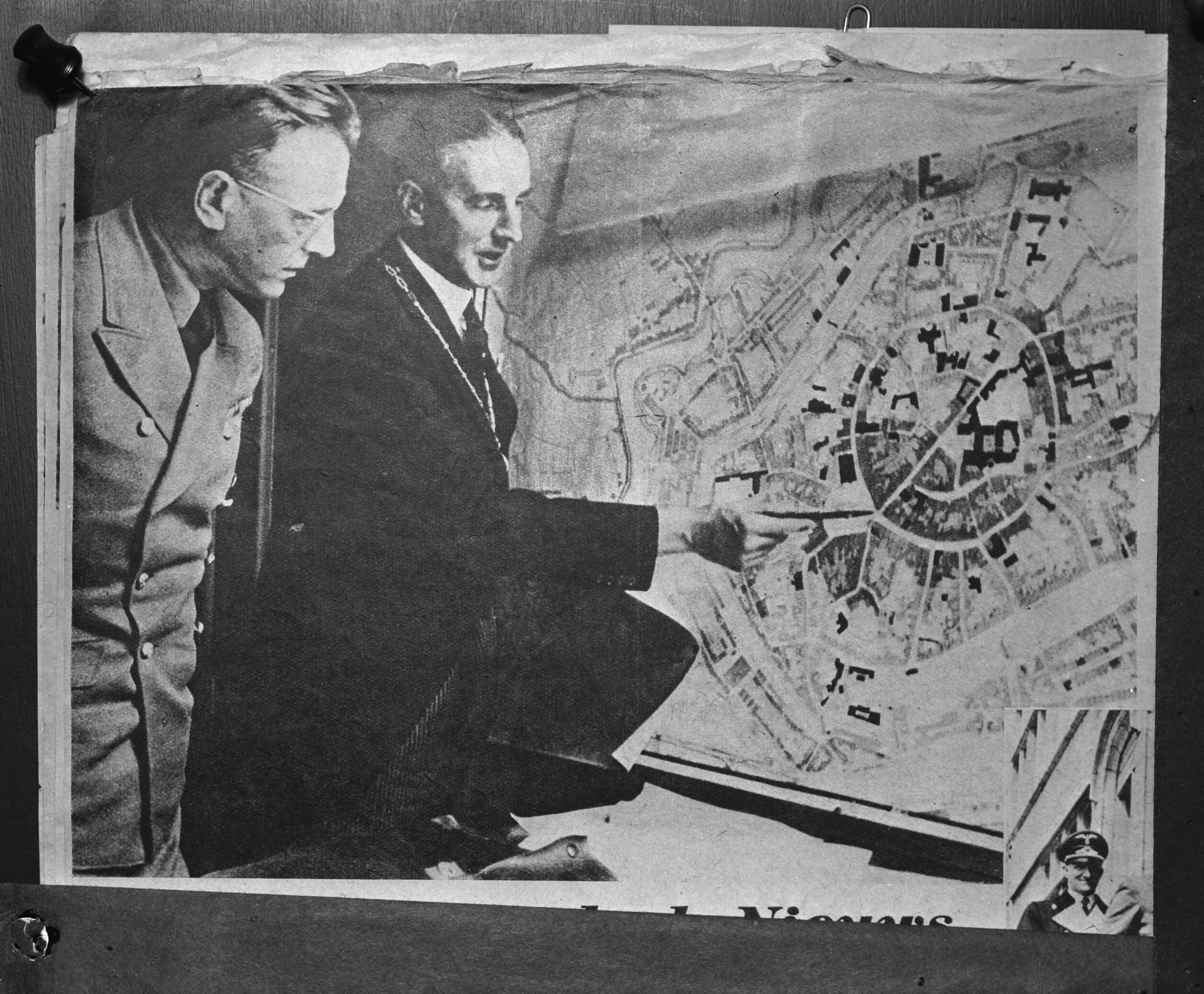 Rijkscommissaris dr. Seyss-Inquart en mr dr. J. van Walre de Bordes, burgemeester van Middelburg, bespreken reconstructieplannen voor de stad