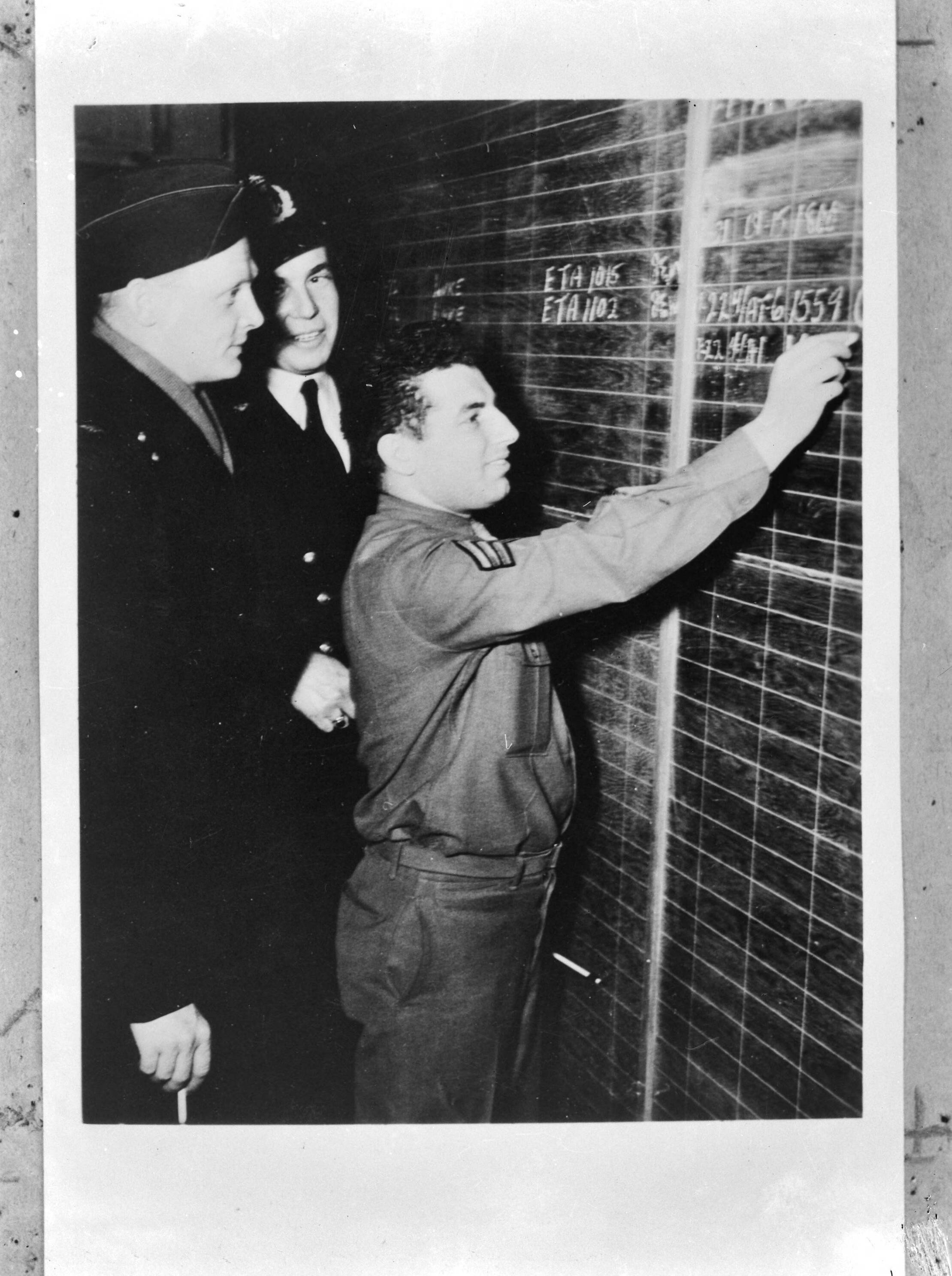 Luitenant Paalman en luitenant-ter-zee Amsterdam kijken toe terwijl een Amerikaanse sergeant van het bureau Operatiën van Luke Airfield, Phoenix Arizona, iets op het planbord schrijft